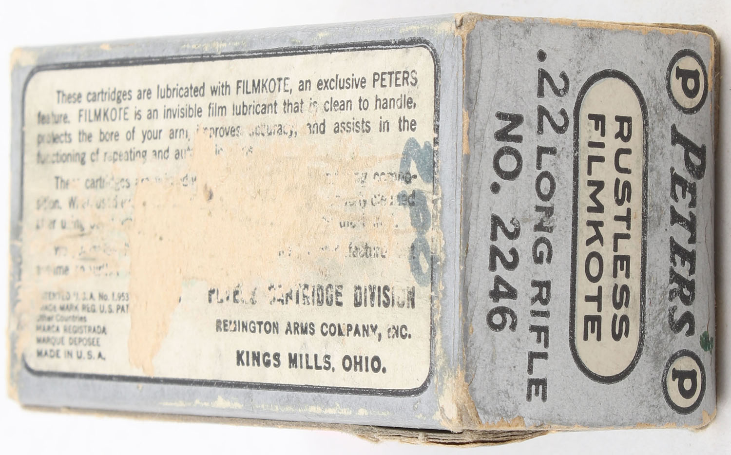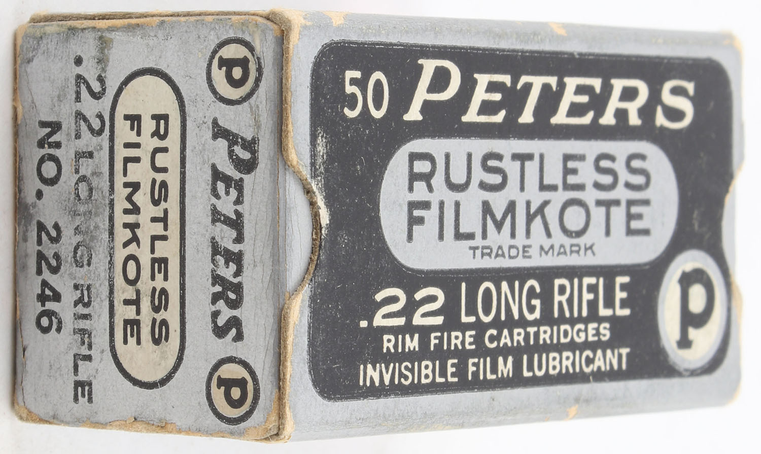 Peters, Rustless Filmkote, .22 Long Rifle, RHWeb: PCC-12 LR-1 (with ''F'' bottom) Partial 48rds., 1pc. Black & silver box, box is solid with very good to excellent color, some shelf wear, minor edge & corner wear, end flaps are solid, ammo is excellent. Grade: Very Good ++ - Value: 8 to 12