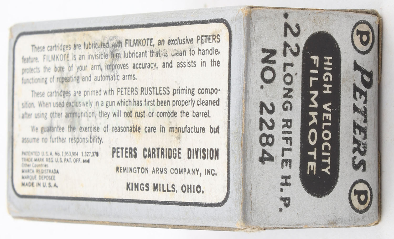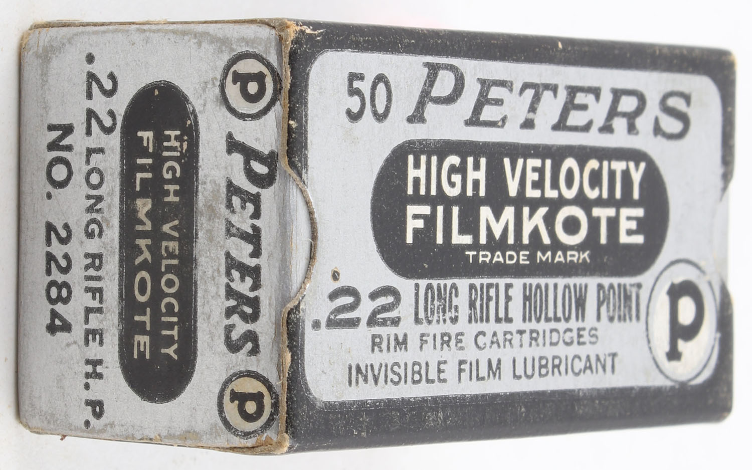 Peters, High Velocity Filmkote, .22 Long Rifle Hollow Point, RHWeb: PCC-13 LR-2g, Full, 1pc. Silver & black box, box is solid with excellent color, very minor corner wear, edges are crisp, end flaps are solid, ammo is excellent. Grade: Excellent - Value: 24 to 36