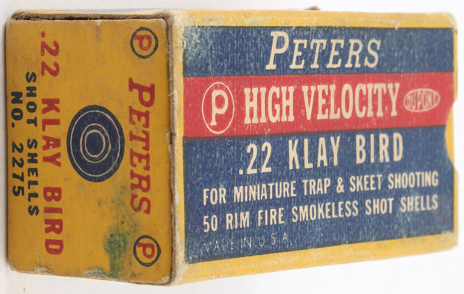 Peters, High Velocity Klay Bird, .22 Long Rifle Shot, RHWeb: PCC-14 LR-3, Full, 1pc. Blue yellow & red box, box is solid with very good to excellent color, minor age soiling & shelf wear, very minor corner wear, edges are crisp, end flaps are solid, ammo is very good to excellent. Grade: Very Good ++ - Value: 100 to 150