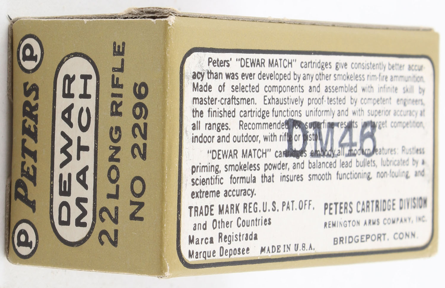 Peters, Dewar Match, .22 Long Rifle, RHWeb: PCC-53B LR-2c, Full, 1pc black & gold box, box is near mint with minty color, only very minor corner wear on bottom front corner, corners otherwise sharp, edges are crisp, end flaps are solid, ammo is excellent. Grade: Excellent ++ - Value: 40 to 150