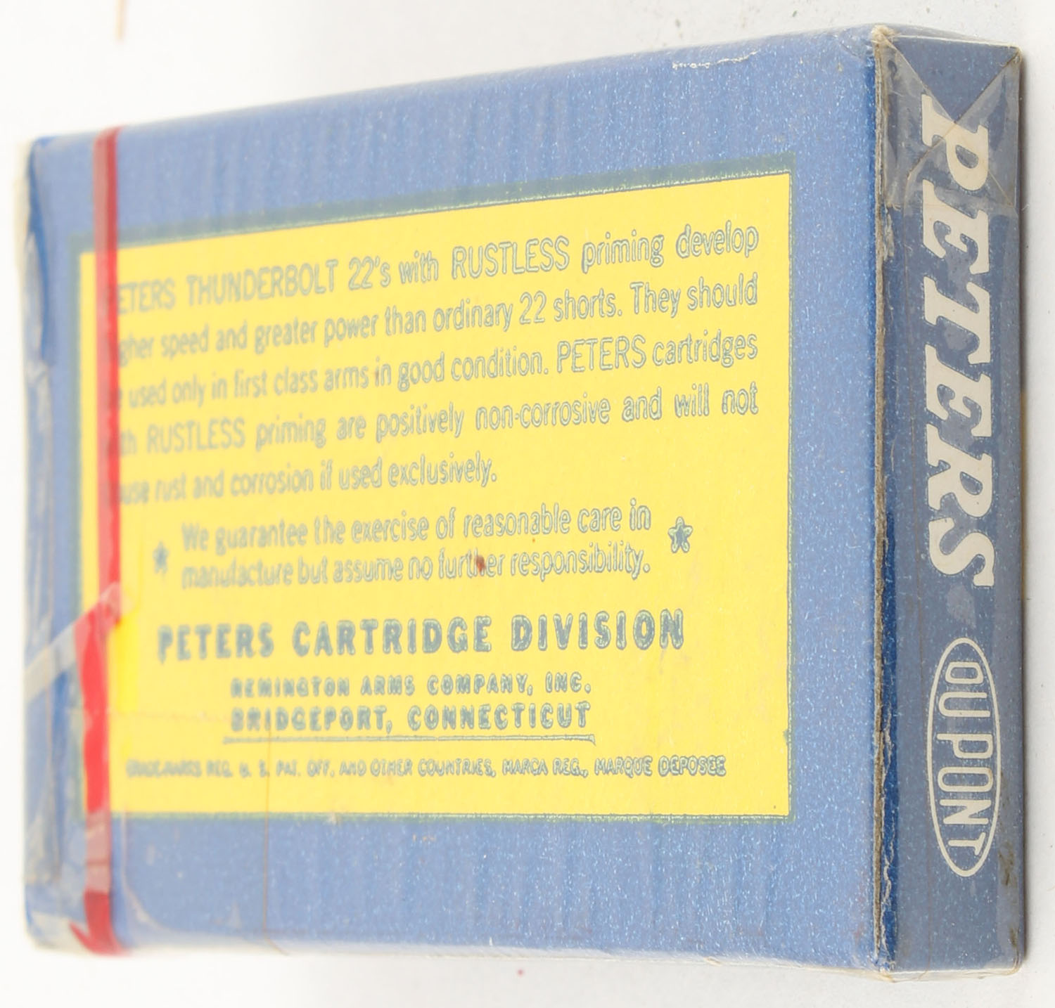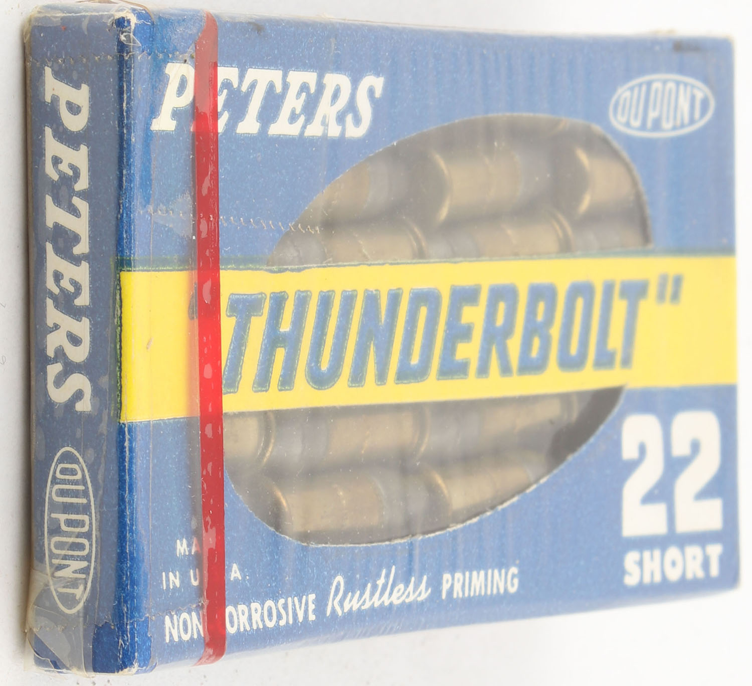Peters, ''Thunderbolt'', .22 Short, RHWeb: PCC-17 S-5, FULL & SEALED, 1pc. Blue yellow & white flat pack, pack is solid with minty color, corners are sharp, edges are crisp, ammo appears very good. Grade: Excellent ++ - Value: 60 to 90