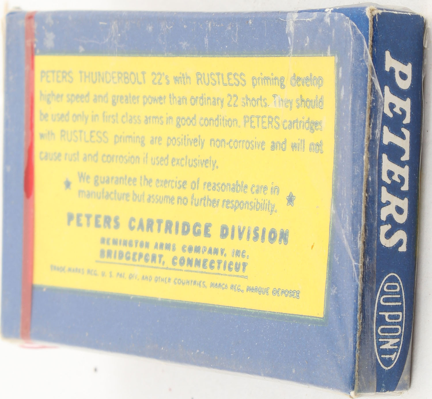 Peters, ''Thunderbolt'', .22 Short, RHWeb: PCC-17 S-5, FULL & SEALED, 1pc. Blue yellow & white flat pack, pack is solid with minty color, corners are sharp, edges are crisp, ammo appears very good. Grade: Excellent ++ - Value: 60 to 90