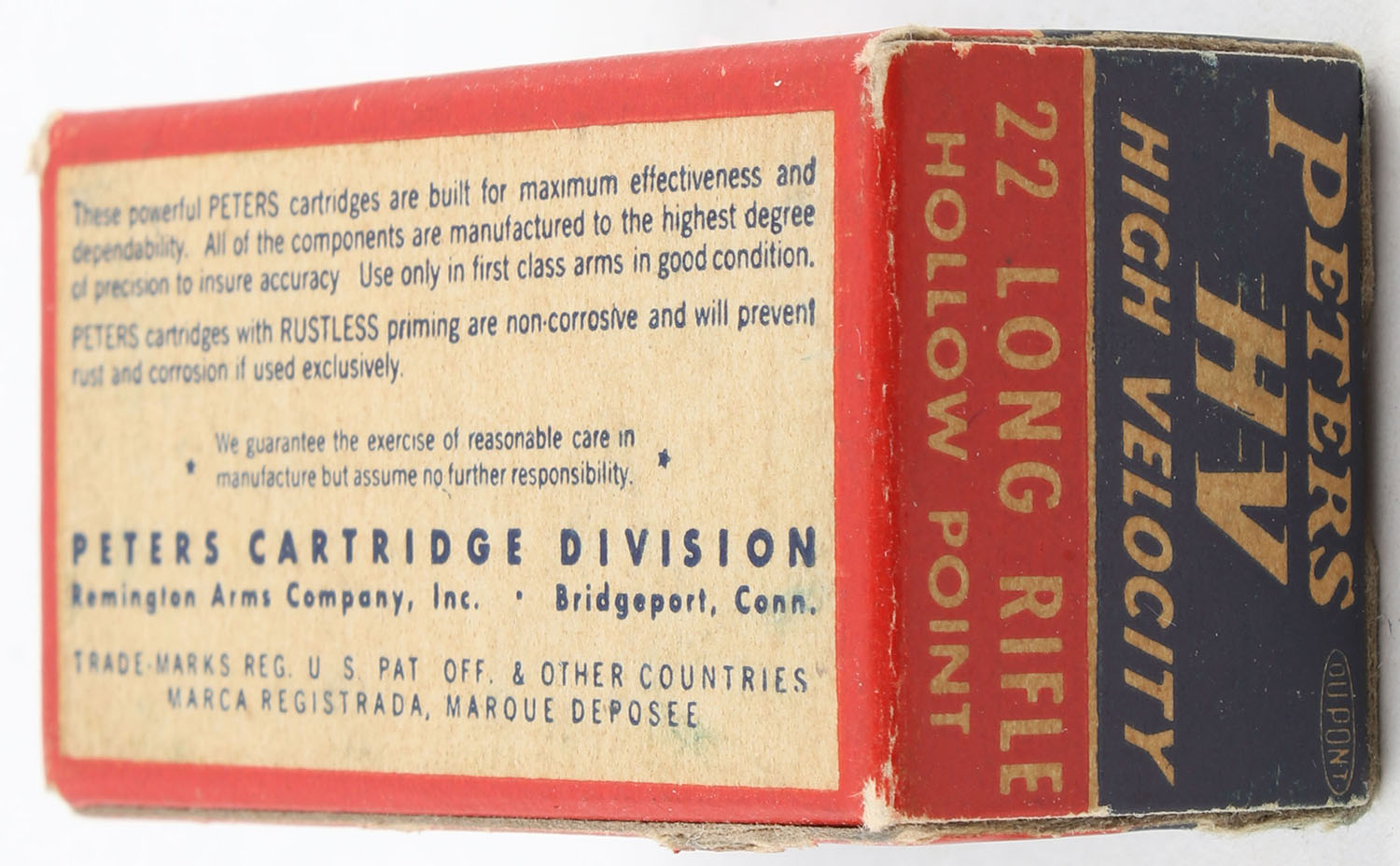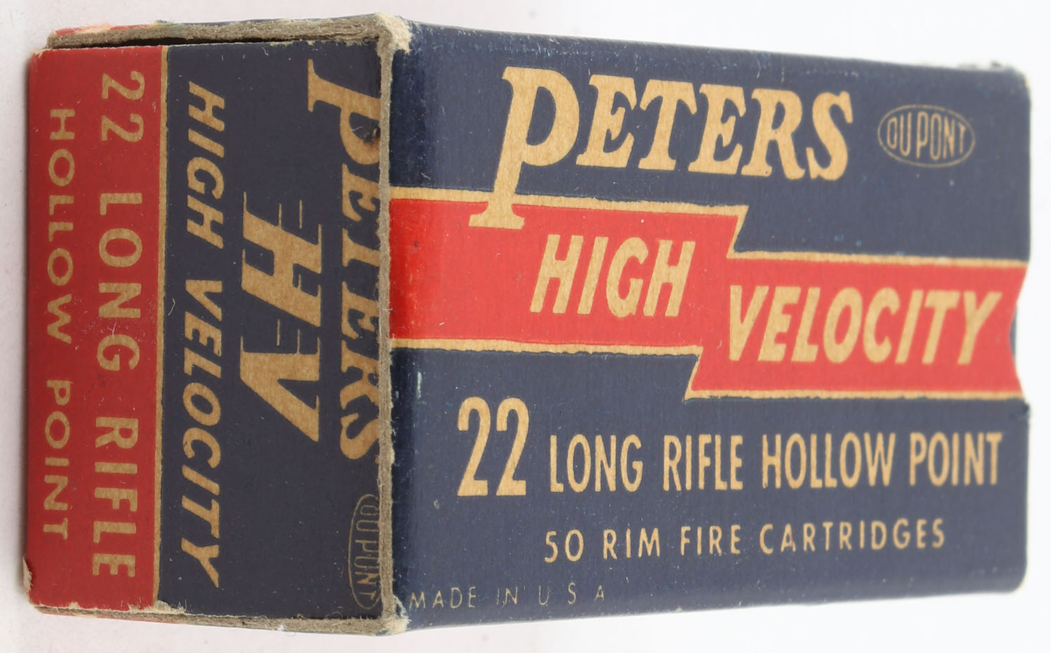 Peters, High Velocity, .22 Long Rifle Hollow Point, RHWeb: PCC-17 LR-3b, Full, 1pc. Blue red & white box, box is solid with very good to excellent color, minor age soiling, very minor corner wear, edges are crisp, end flaps are solid, ammo is minty. Grade: Excellent - Value: 12 to 18