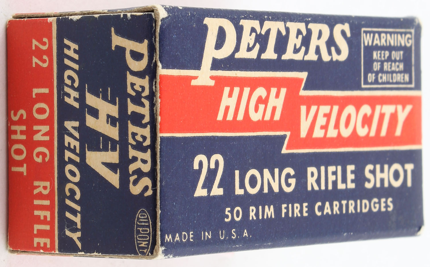Peters, High Velocity, .22 Long Rifle Shot, RHWeb: PCC-17A LR-5, Full, 1pc. Blue red & white box, box is solid with excellent color, very minor corner wear, edges are crisp, end flaps are solid, ammo is minty. Grade: Excellent + - Value: 12 to 18