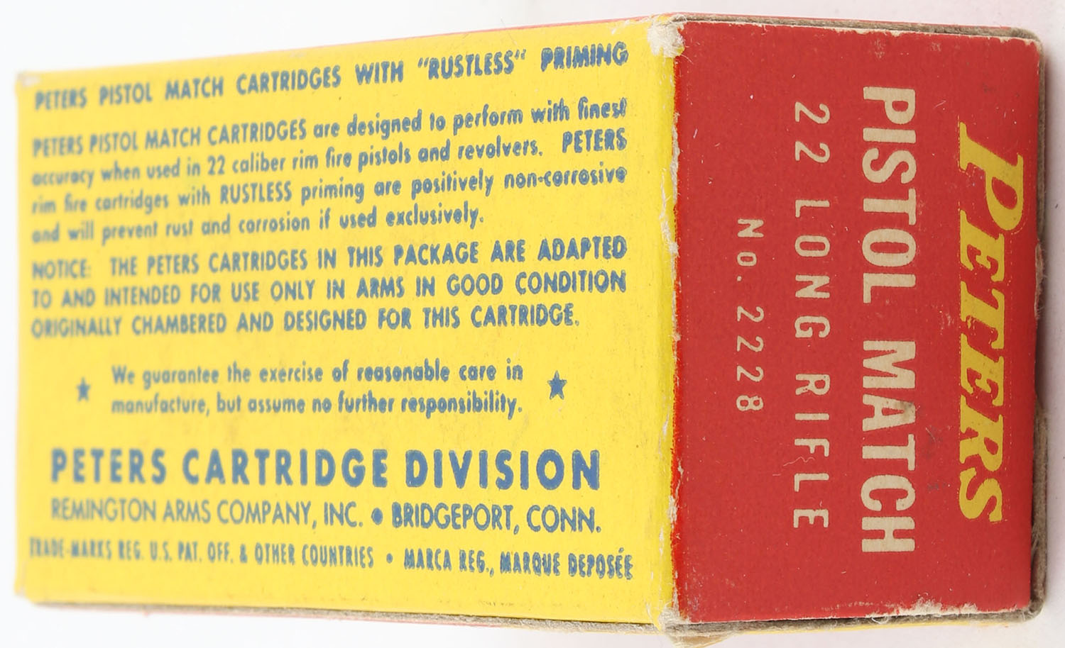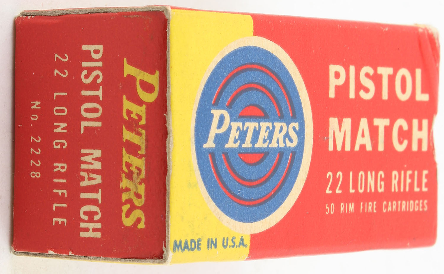 Peters, Pistol Match, .22 Long Rifle, RHWeb: PCC-55 LR-2d, Full, 1pc. Red yellow & blue box, box is solid with excellent color, very minor corner wear, edges are crisp, end flaps are solid, ammo is excellent to minty. Grade: Excellent + - Value: 24 to 36