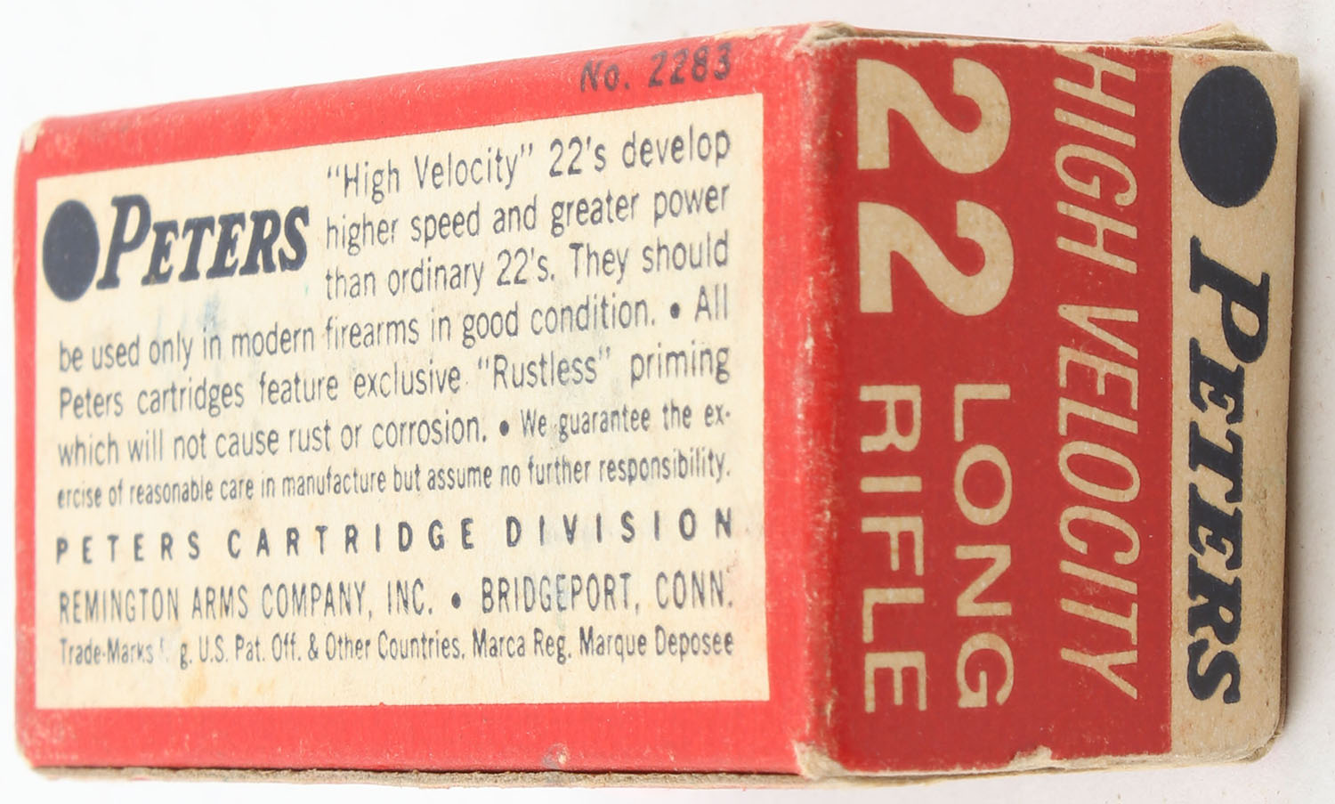 Peters, New High Velocity, .22 Long Rifle, RHWeb: PCC-18 LR-1, Full, 1pc. Red white & blue box, box is solid with very good color, minor age soiling & corner wear, very minor edge wear, end flaps are solid, ammo is excellent. Grade: Excellent - Value: 8 to 12