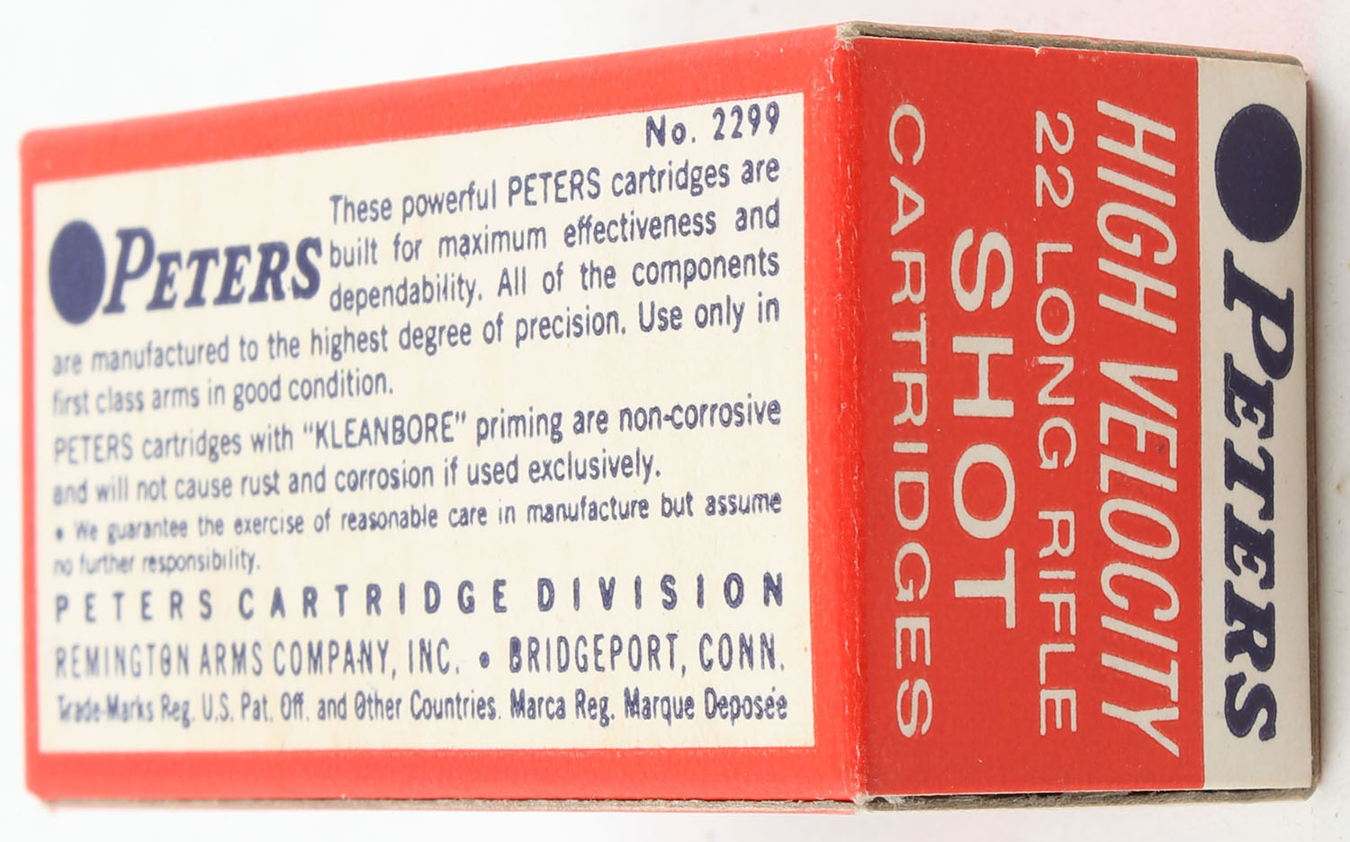 Peters, Rim Fire Cartridges, .22 Long Rifle Shot, RHWeb: PCC-20 LR-4b, Full, 1pc. Red white & blue box, box is solid with excellent color, very minor age soiling, corners are sharp, edges are crisp, end flaps are solid, ammo is excellent to minty. Grade: Excellent ++ - Value: 14 to 20