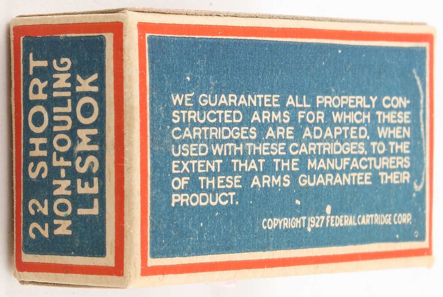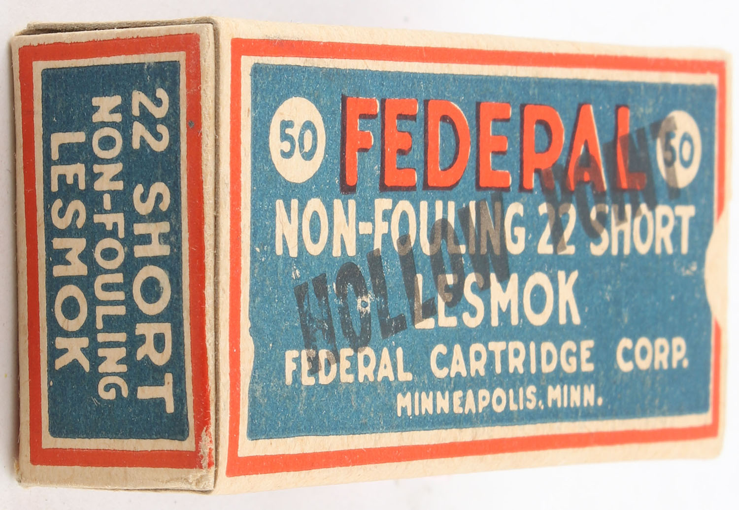 Federal, Non-Fouling Lesmok, .22 Short Hollow Point, RHWeb: FCC-2 S-4, Full, 1pc. Blue red & white box with black ''Hollow-Point'' over-stamp, box is solid with excellent color, very minor age soiling, corners are mostly sharp, edges are crisp, end flaps are solid, ammo is very good to excellent. Grade: Excellent + - Value: 120 to 180