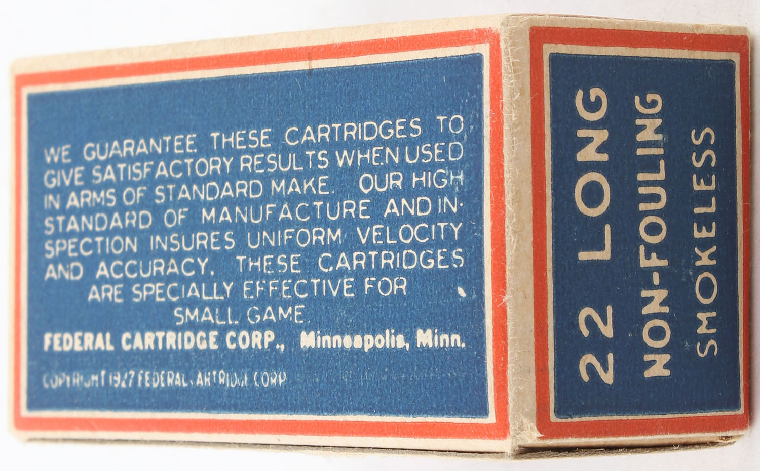 Federal, Non-Fouling Copper Coated, .22 Long, FCC-3 L-2b, Full, 1pc. Blue red & white box, box is near mint with excellent color, only very minor age soiling, corners are mostly sharp, edges are crisp, end flaps are solid, ammo is excellent. Grade: Excellent ++ - Value: 90 to 135