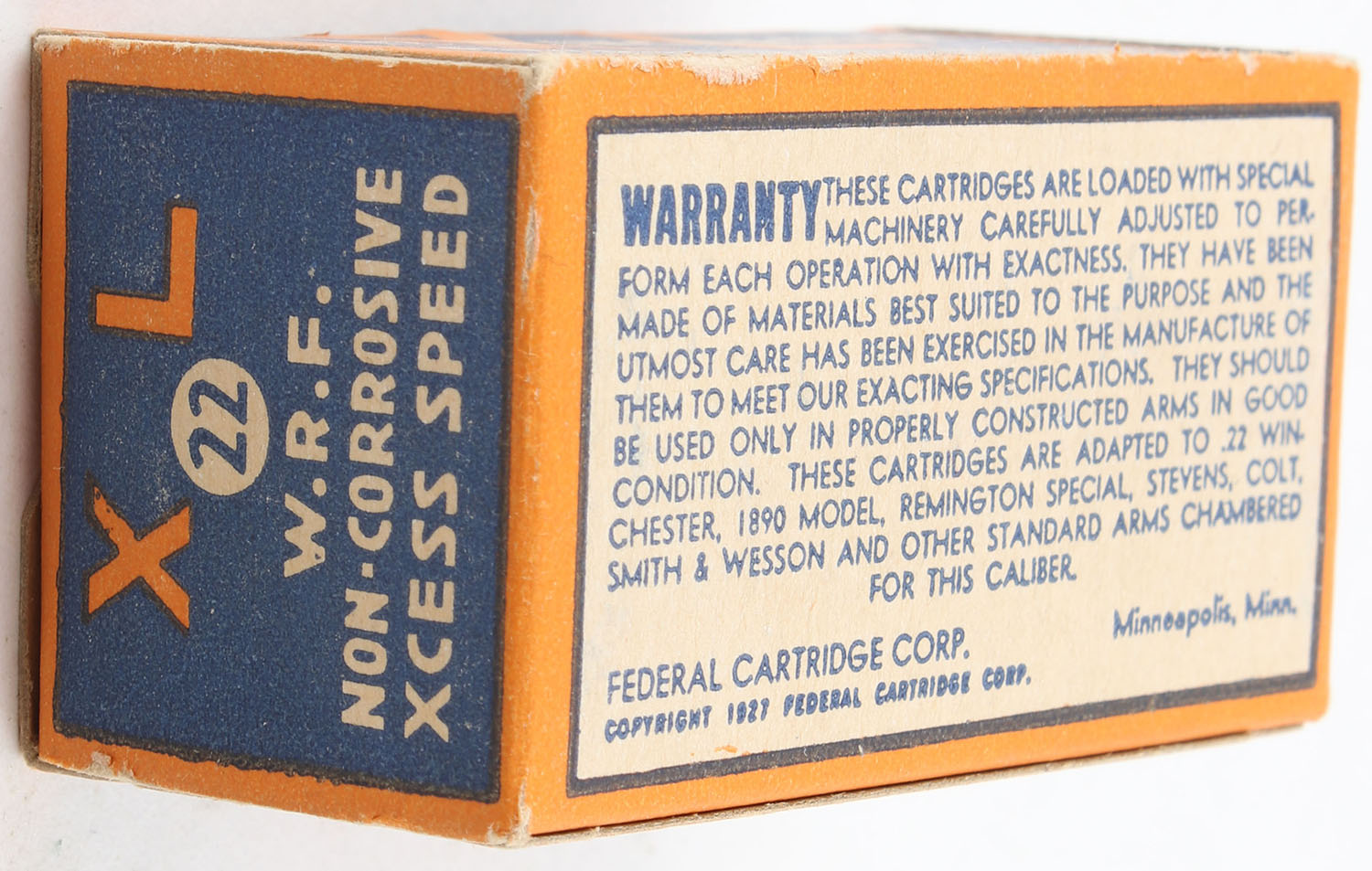 Federal, XL Cartridges, .22 W.R.F., Xcess Speed, RHWeb: FCC-4.1 WRF-1a, Full, 1pc. Blue orange & white box, box is solid with excellent color, very minor corner wear, edges are mostly crisp, end flaps are solid, ammo is excellent. Grade: Excellent + - Value: 150 to 225