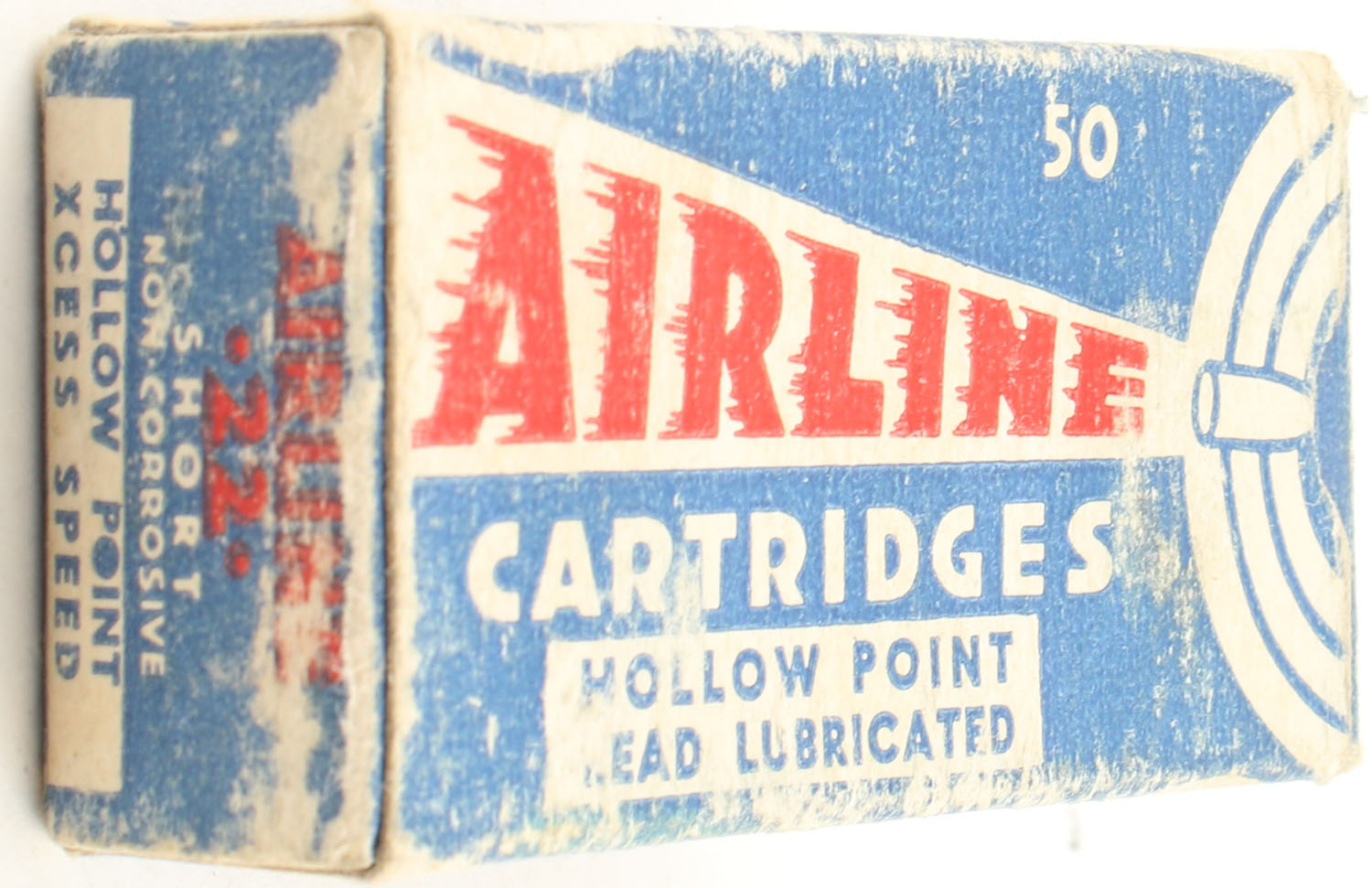 Federal, Airline, .22 Short Hollow Point, Lead Lubricated, RHWeb: FCC-4.3 S-10, Full, 1pc. Blue white & red box, box is solid with very good color, shelf wear, some edge & corner wear, end flaps are solid, ammo is very good. Grade: Very Good + - Value: 24 to 36