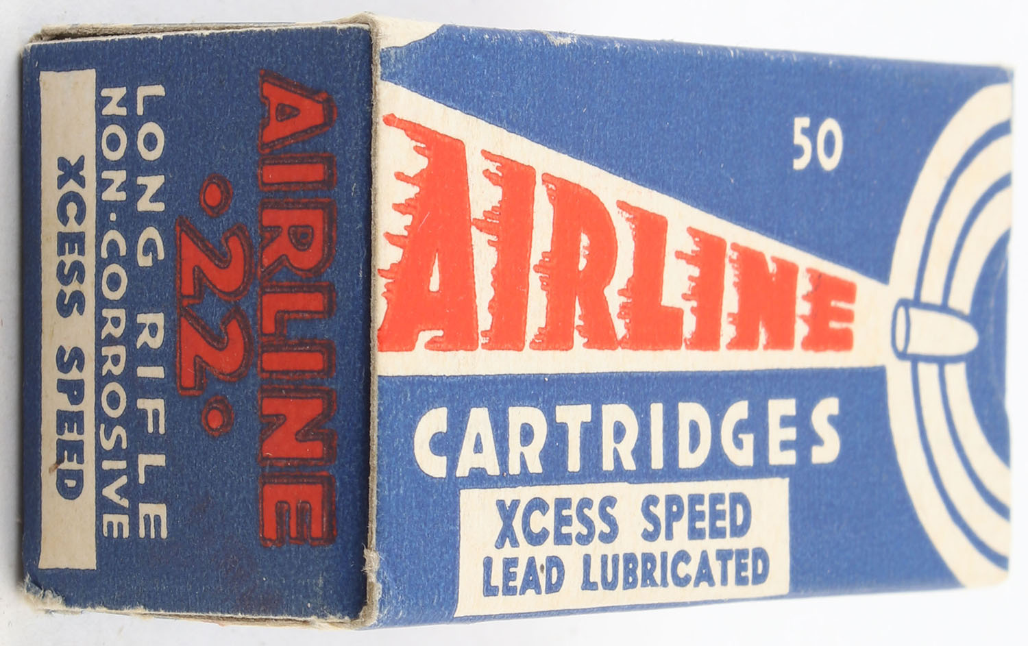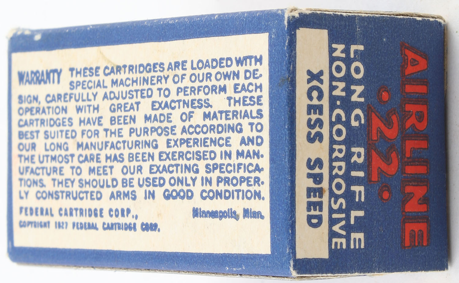 Federal, Airline, .22 Long Rifle, Xcess Speed, RHWeb: FCC-4.3 LR-9b, Full, 1pc. Blue white & red box, box is solid with excellent to minty color, very minor corner wear, edges are crisp, end flaps are solid, ammo is minty. Grade: Excellent ++ - Value: 30 to 45