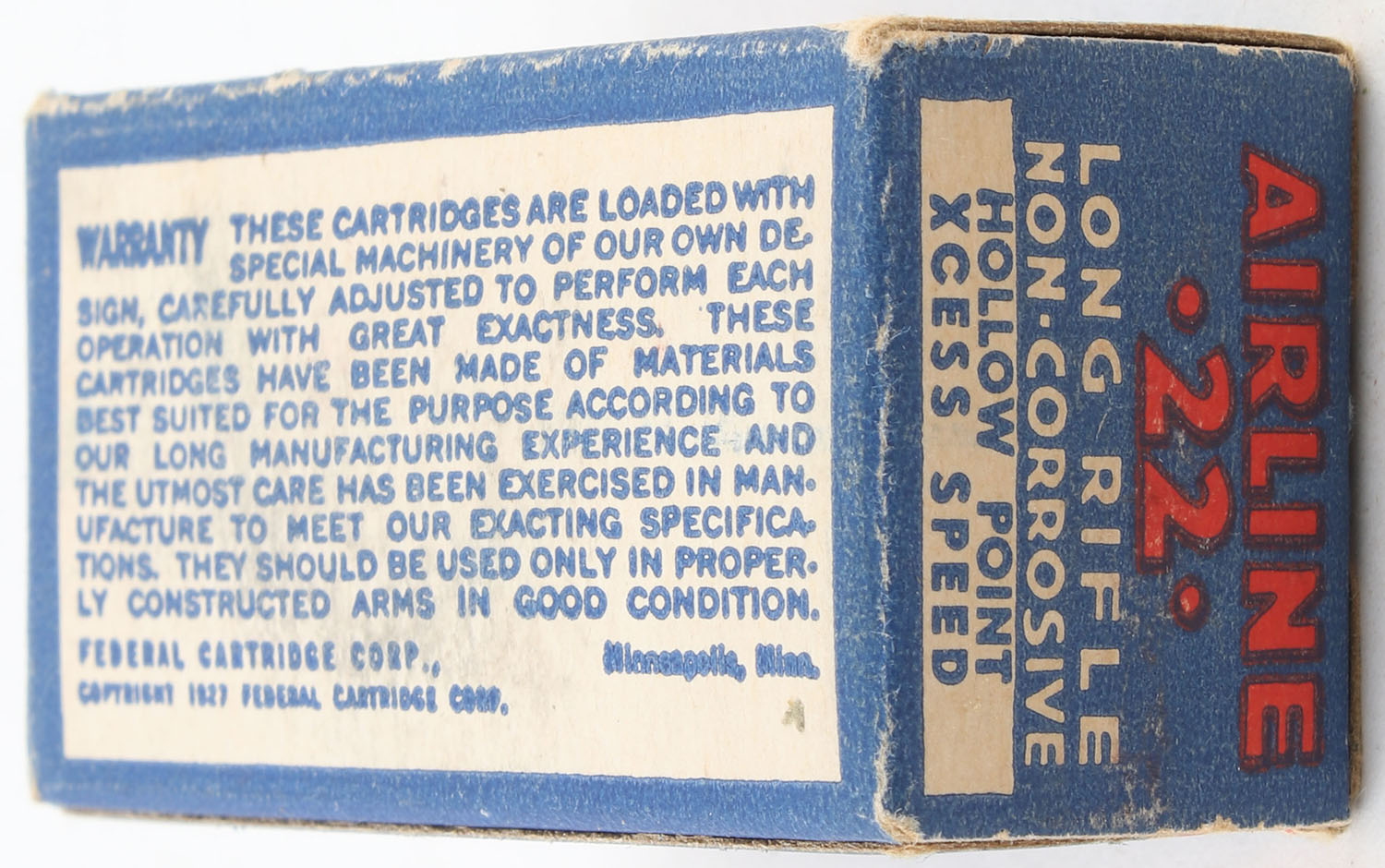 Federal, Airline, .22 Long Rifle Hollow Point, Lead Lubricated, RHWeb: FCC-4.3 LR-10b, Full, 1pc. Blue white & red box, box is solid with excellent to minty color, very minor corner wear, edges are crisp, end flaps are solid, ammo is minty. Grade: Excellent ++ - Value: 30 to 45