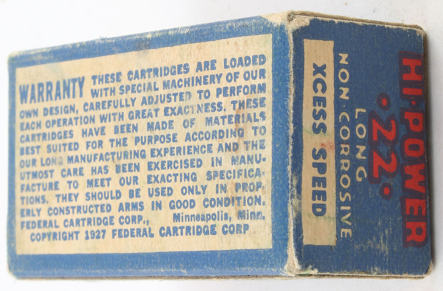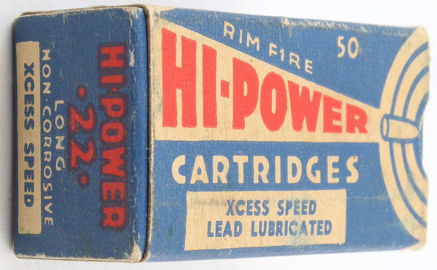 Federal, Hi-Power, .22 Long, Xcess Speed, RHWeb: FED-5 L-1b, Full, 1pc. Blue white & red box, box is solid with very good color, some age soiling, minor shelf wear, very minor corner wear, edges are crisp, end flaps are solid, ammo is very good to excellent. Grade: Very Good ++ - Value: 10 to 15