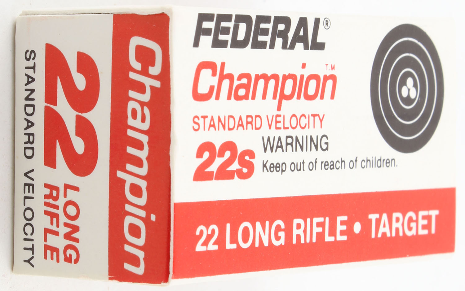 Federal, Champion, .22 Long Rifle, Standard Velocity, RHWeb: FED-14 LR-1a, Full, 1pc. White red & black box, box is MINT with minty color, corners are sharp, edges are crisp, end flaps are solid, ammo is excellent. Grade: MINT - Value: 6 to 10