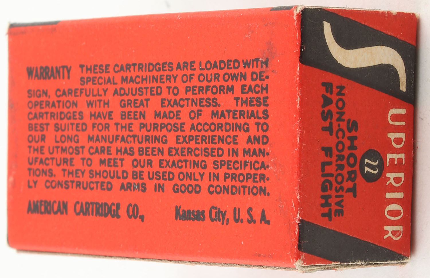 American, Superior Cartridges, .22 Short, Fast Flight, RHWeb: ACC-2 S-1a, Full, 1pc. Red black & white box, box is solid with excellent color, very minor age soiling, corners are mostly sharp, edges are crisp, end flaps are solid, ammo is minty. Grade: Excellent ++ - Value: 30 to 45