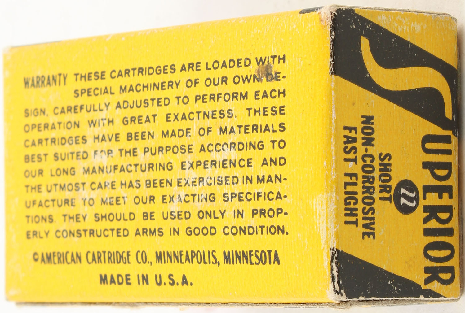 American, Superior Cartridges, .22 Short, Fast Flight, RHWeb: ACC-4 S-1a, Full, 1pc. Yellow & black box with white child warning label, box is near mint with minty color, only very minor age soiling to child warning, corners are mostly sharp, edges are crisp, end flaps are solid, ammo is minty. Grade: Excellent ++ - Value: 20 to 30