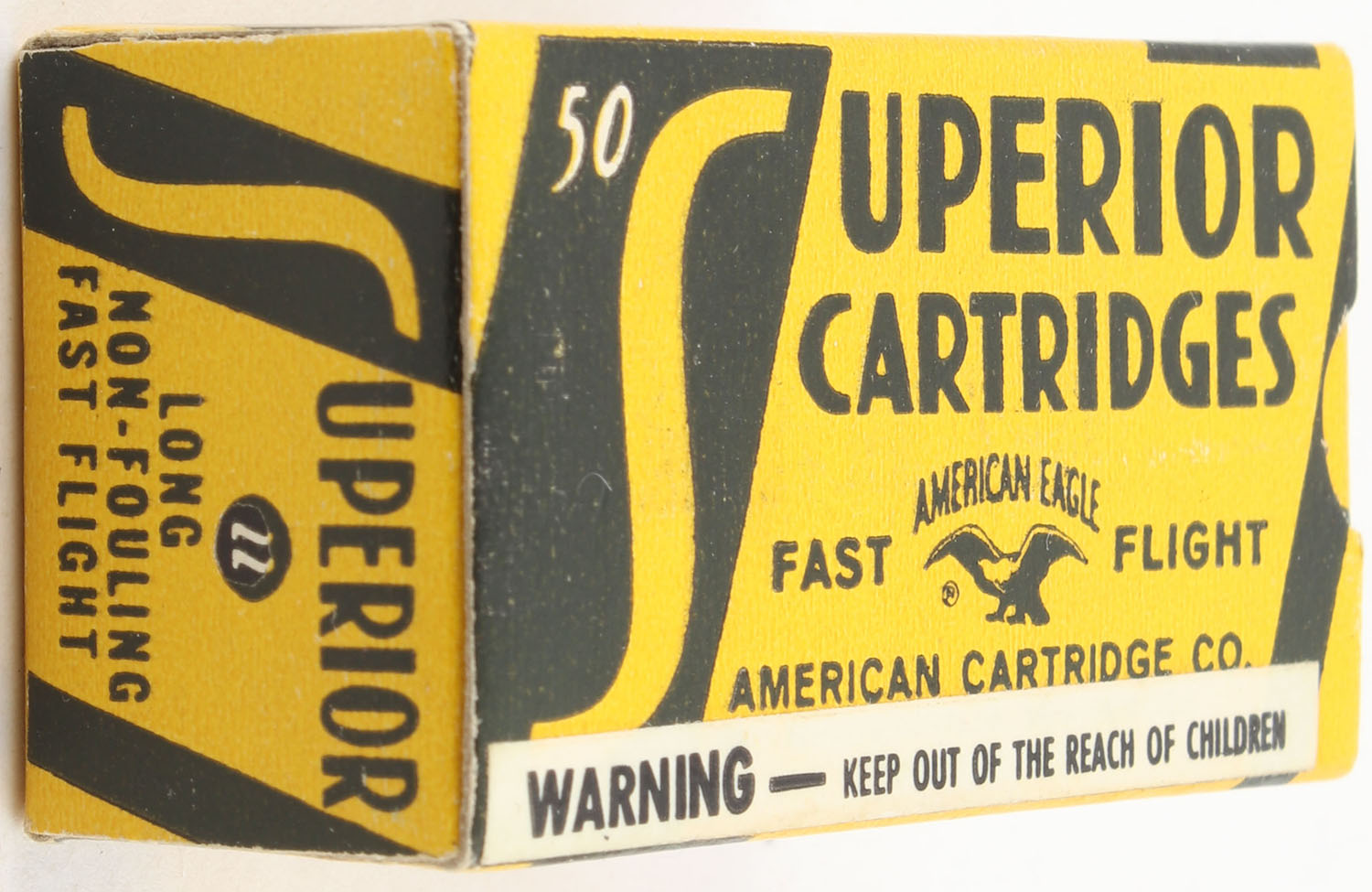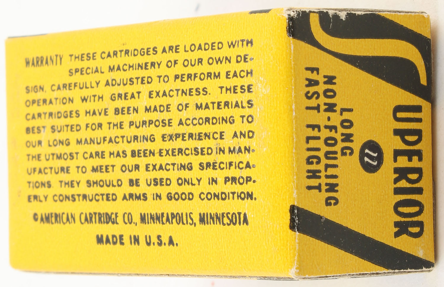 American, Superior Cartridges, .22 Long, Fast Flight, RHWeb: ACC-4 L-1a, Full, 1pc. Yellow & black box with white child warning label, box is MINT with minty color, corners are sharp, edges are crisp, end flaps are solid, ammo is minty. Grade: MINT - Value: 50 to 75