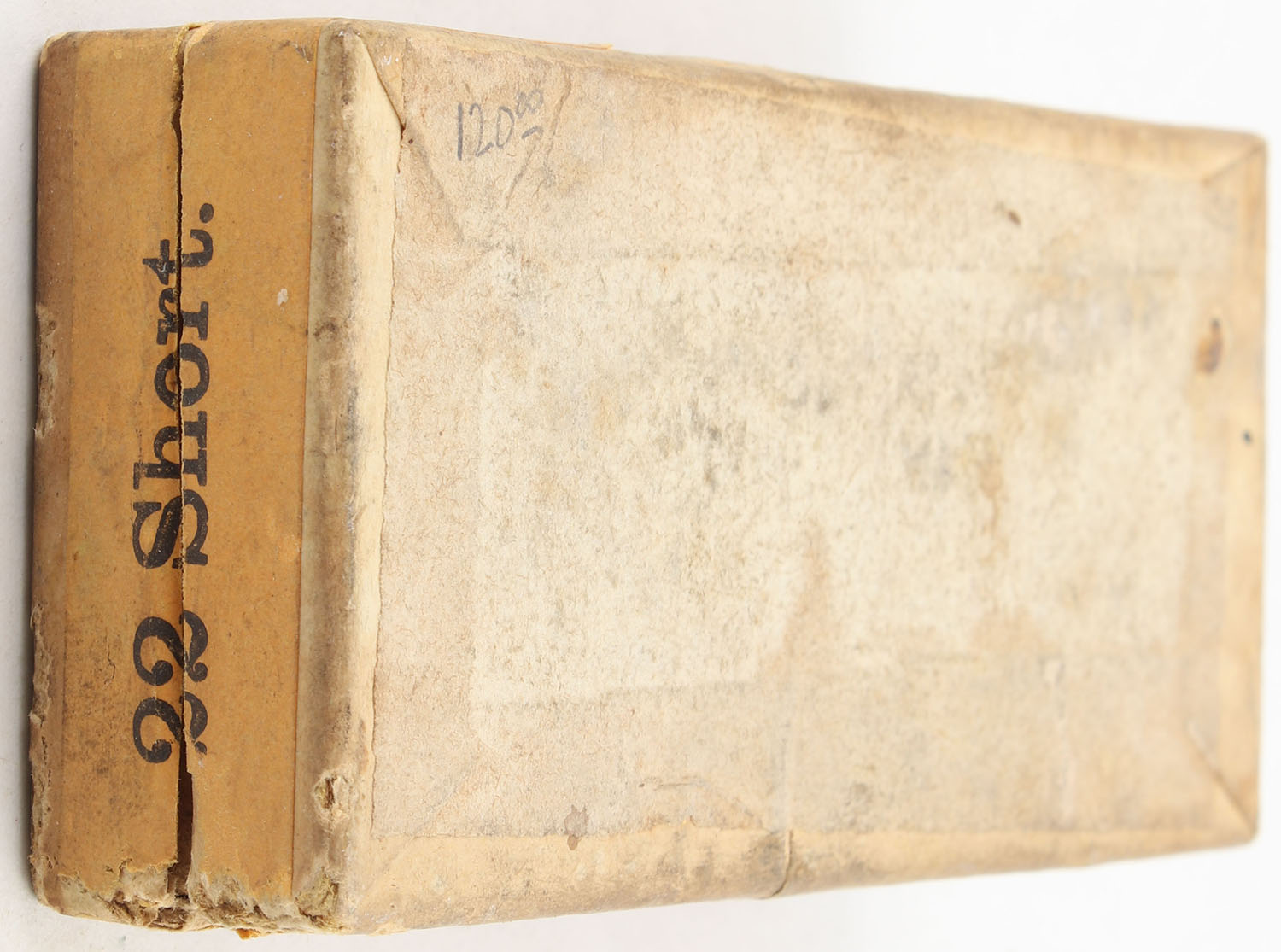 U.S., Metallic Cartridges, .22 Short, Target Cartridges, RHWeb: US-2 S-1b, Partial 46rds., 2pc. Buff box with gray top & orange side sealing labels, box is solid with very good color, some age soiling & staining, minor edge & corner wear, top label is 90% intact, side sealing label is 80% intact. Grade: Very Good - Value: 80 to 120