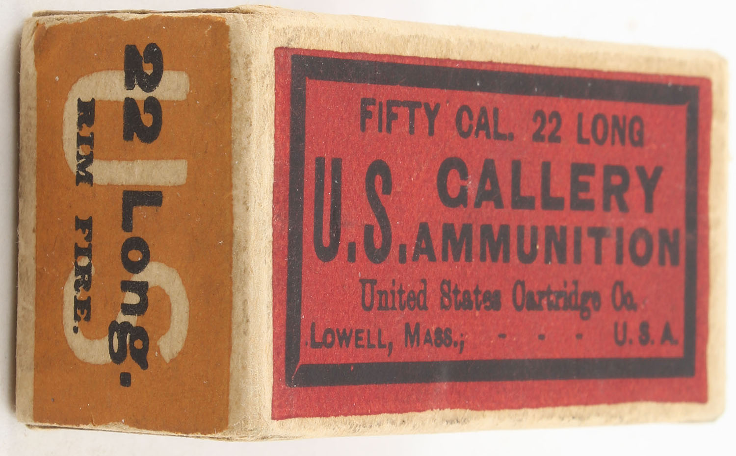 U.S., Gallery Ammunition, .22 Long, Target Cartridges, RHWeb: US-50A L-2.2, Full, 1pc. Red & orange box, box is solid with very good color, minor age soiling, some corner wear, very minor edge wear, end flaps are solid, ammo is fair to good. Grade: Very Good - Value: 60 to 90