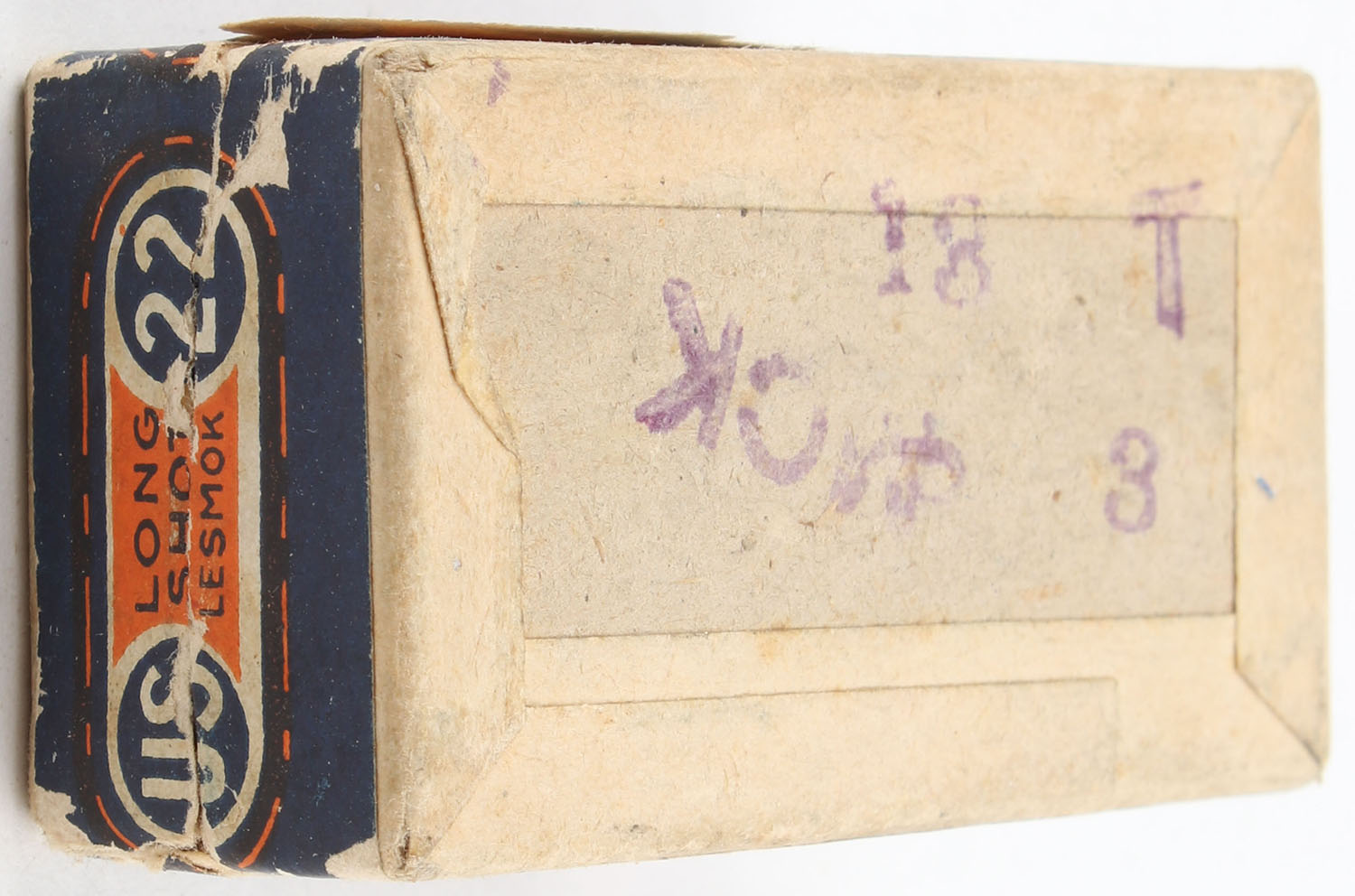 U.S., Rim Fire, .22 Long Shot, Lesmok, RHWeb: US-7 L-1a, full, 2pc. Buff box with blue & orange top & side sealing labels, box is solid with excellent color, very minor color fading, seam split to top left edge, vertical seam split to front right corner, some edge & corner wear, labels are intact, ammo is excellent. Grade: Very Good + - Value: 40 to 60