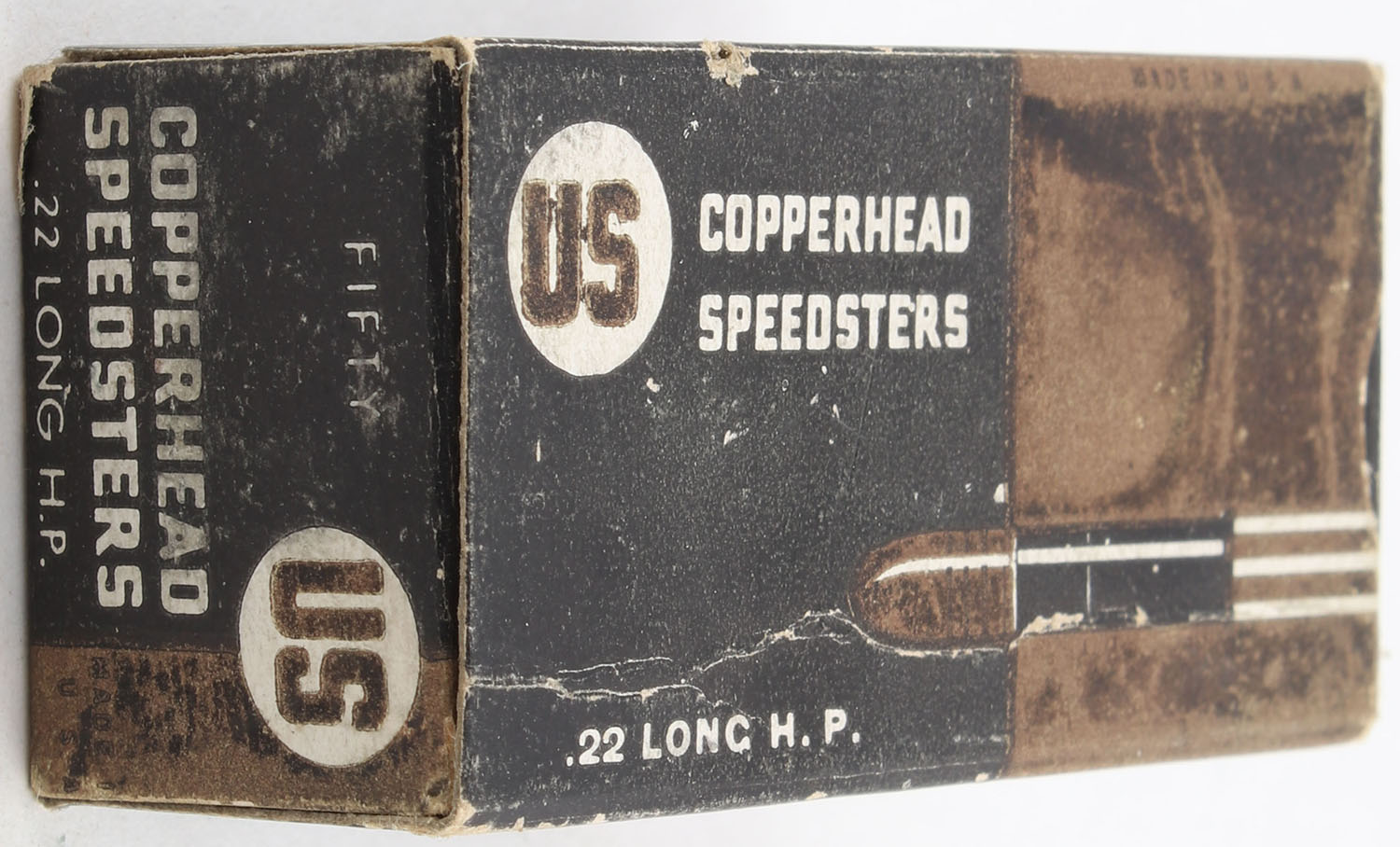 U.S., Copperhead Speedsters, .22 Long Hollow Point, RHWeb: US-13 L-3b, Full, 1pc. Black & brown box, box is solid with good color, some age soiling & staining, minor shelf & corner wear, very minor edge wear, end flaps are solid, ammo is excellent. Grade: Good + - Value: 24 to 36