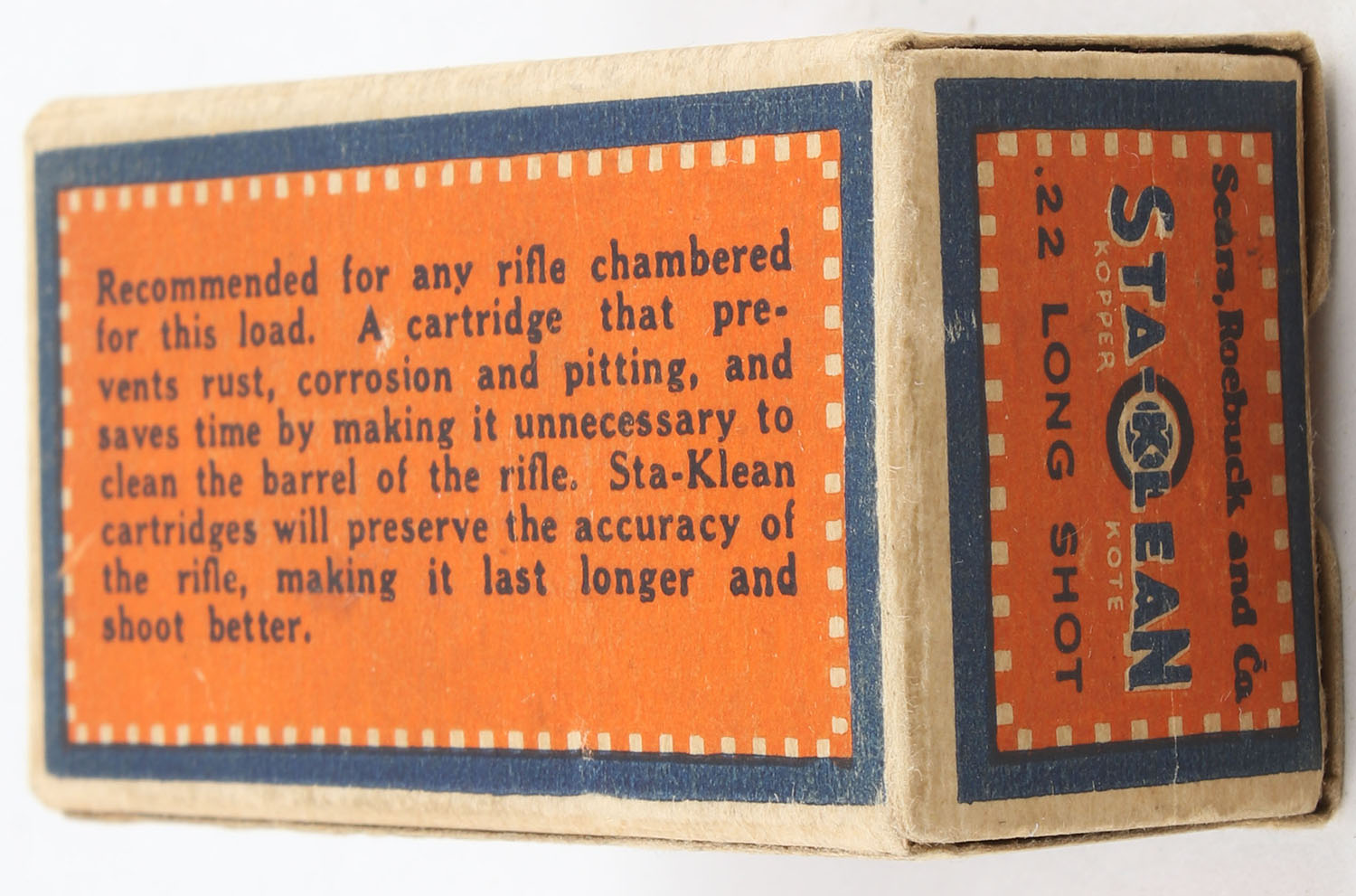 Sears, Sta-Klean, .22 Long Shot, Kopper Kote, RHWeb: SEARS-3 L-2, Partial 8rds., 1pc. Orange blue & buff box, box is solid with very good to excellent color, minor age soiling, very minor corner wear, edges are crisp, end flaps are solid, ammo is excellent. Grade: Excellent - Value: 10 to 15