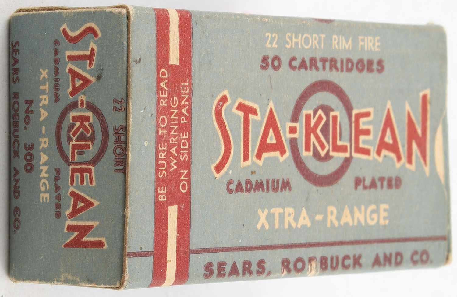 Sears, Sta-Klean, .22 Short, Cadmium Plated, RHWeb: SEARS-4 S-1b, Full, 1pc. Blue maroon & white box, box is solid with very good color, minor age soiling & color fading, very minor corner wear, edges are mostly crisp, end flaps are solid, ammo is excellent. Grade: Very Good + - Value: 10 to 15