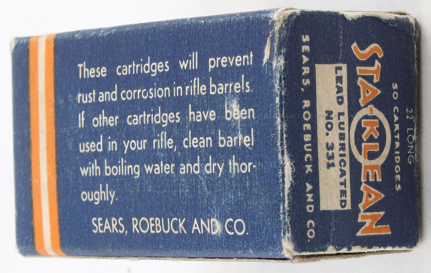 Sears, Sta-Klean, .22 Long, Lead Lubricated, RHWeb: SEARS-5 L-1a, Full, 1pc. Blue orange & white box, box is solid with excellent color, very minor shelf wear, minor corner wear, edges are mostly crisp, end flaps are solid, ammo is very good to excellent. Grade: Very Good ++ - Value: 10 to 15