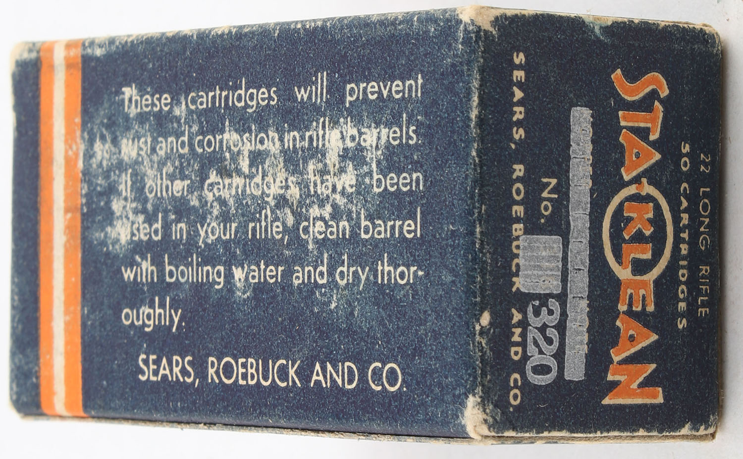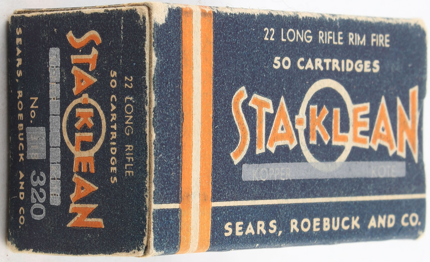 Sears, Sta-Klean, .22 Long Rifle, RHWeb: SEARS-5 LR-4, Full, 1pc. Blue orange & white box, marked out 'Kopper Kote', box is solid with very good color, minor age soiling & corner wear, very minor edge wear, end flaps are solid, ammo is excellent. Grade: Very Good ++ - Value: 16 to 24