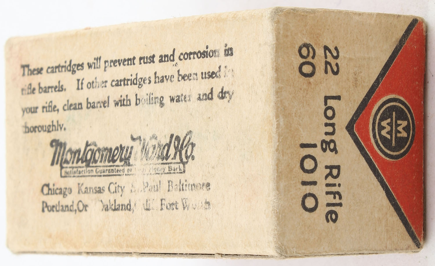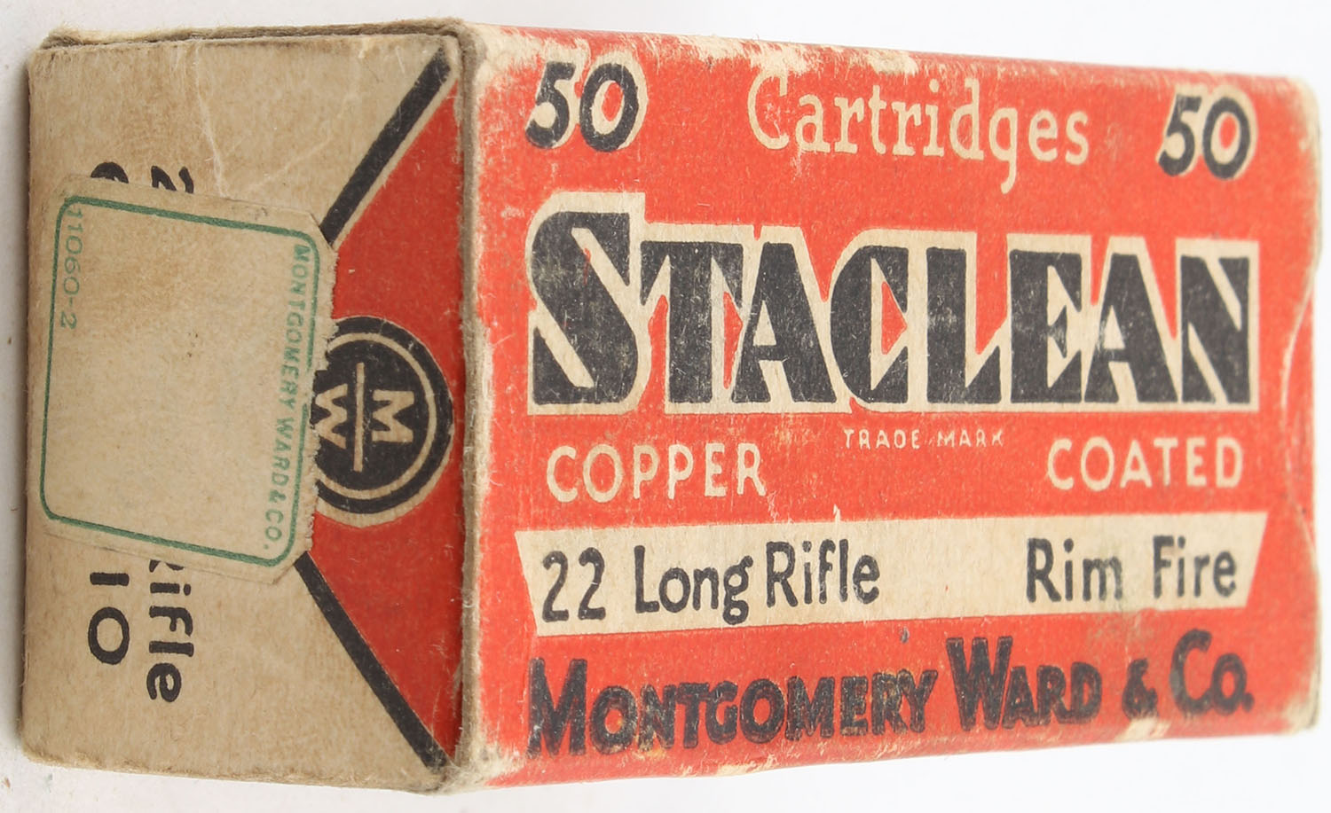 Wards, Staclean, .22 Long Rifle, Copper Coated, RHWeb: MW-3A LR-1, Full, 1pc. Red white & black box, box is solid with very good color, some age soiling, minor edge & corner wear, end flaps are solid, ammo is very good to excellent. Grade: Very Good + - Value: 50 to 75