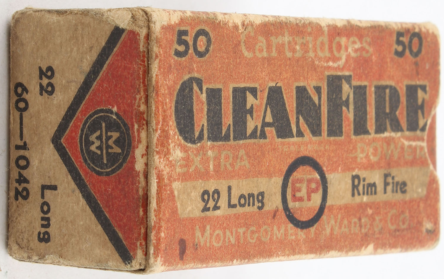 Wards, Cleanfire, .22 Long, Cadmium Plated, RHWeb: MW-3C L-7b, Partial 43rds., 1pc. Red white & black box, box is solid with fair color, age soiling, some staining & shelf wear, some edge & corner wear, end flaps are solid, ammo is very good. Grade: Fair ++ - Value: 20 to 30