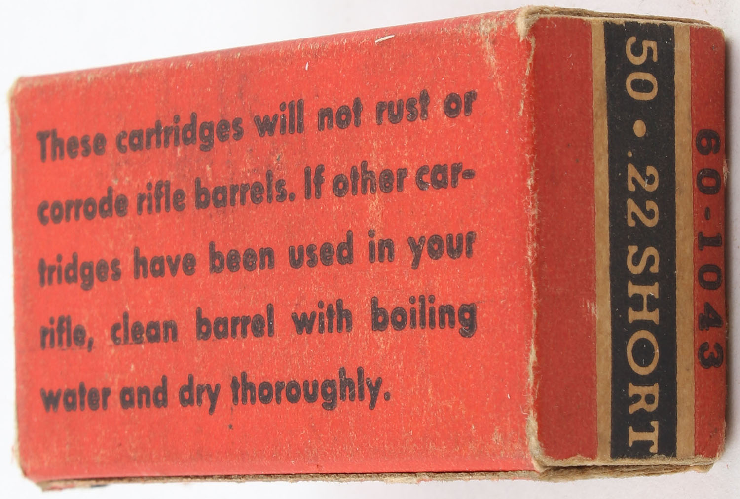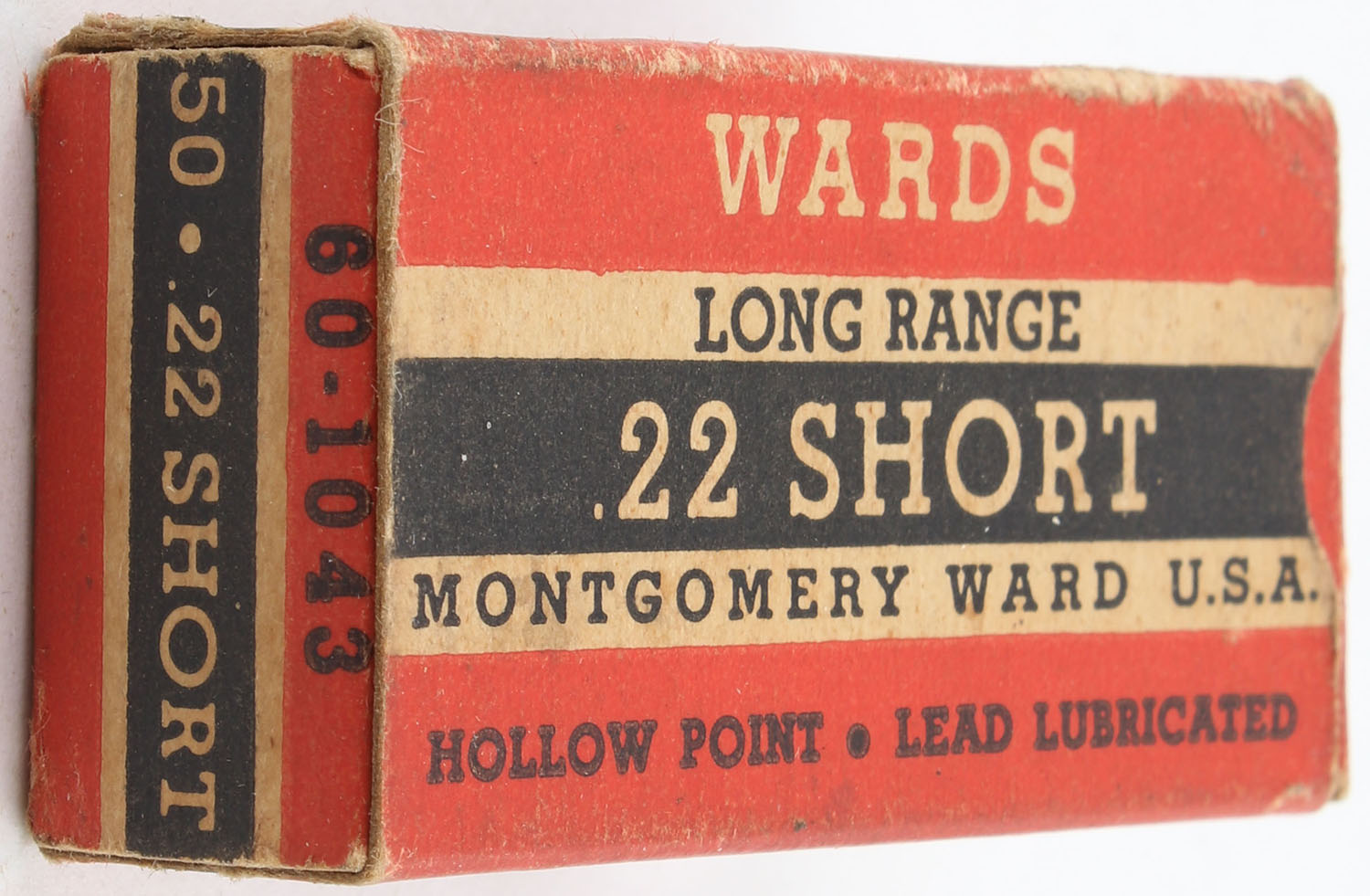Wards, Cleanfire, .22 Short Hollow Point, Lead Lubricated, RHWeb: MW-4B S-2, Full, 1pc. Red white & black box, box is solid with very good color, minor age soiling, very minor corner wear, edges are mostly crisp, end flaps are solid, ammo is excellent. Grade: Excellent - Value: 20 to 30
