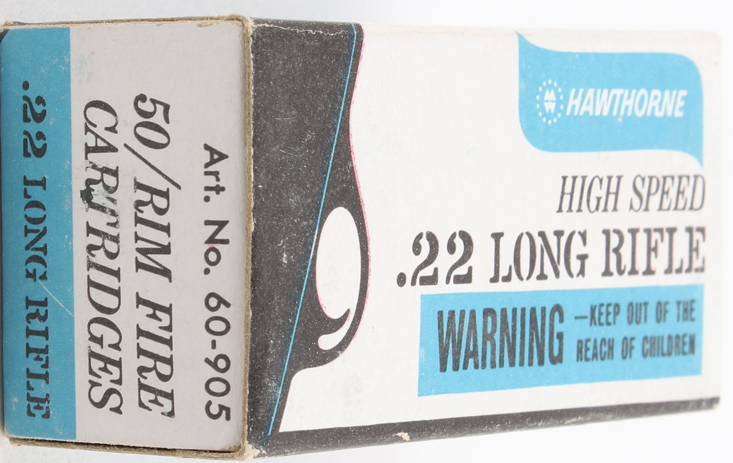 Wards, Hawthorne, .22 Long Rifle, High Speed, RHWeb: MW-7 LR-1a, Full, 1pc. White black & blue box, box is solid with excellent color, minor shelf wear on bottom, very minor edge & corner wear, end flaps are solid, ammo is minty. Grade: Excellent + - Value: 8 to 12