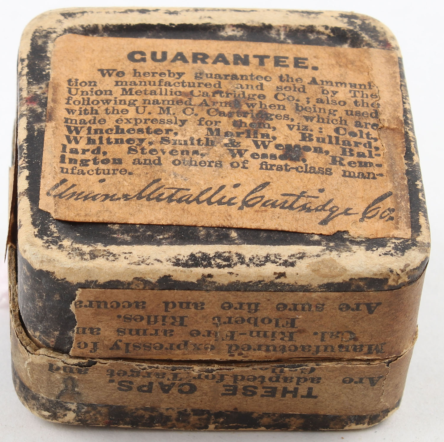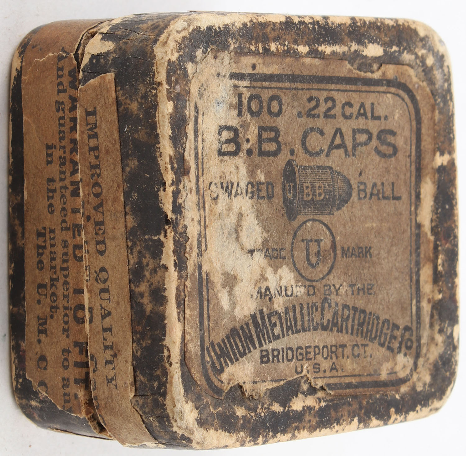 UMC, Swaged Ball, B.B. Caps, RHWeb: UMC-8 BB-2, partial 66rds., 2pc. Black mottled box with white top & side sealing labels, box is solid with poor color, age soiling, shelf wear, some edge & corner wear, side sealing label is 75% intact, ammo is very good. Grade: Good + - Value: 20 to 30