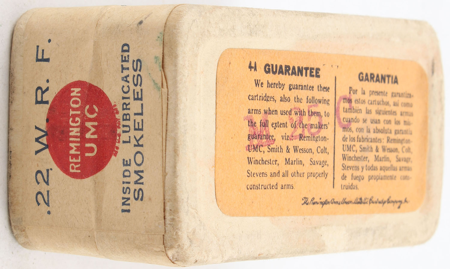 REM-UMC, Rim Fire Cartridges, .22 Winchester, Smokeless, RHWeb: REM-3 WRF-2C, FULL & SEALED, 2pc. Buff box with buff top & side sealing labels, box is solid with excellent color, very minor age soiling & corner wear, edges are mostly crisp, labels are intact. Grade: Excellent + - Value: 80 to 120