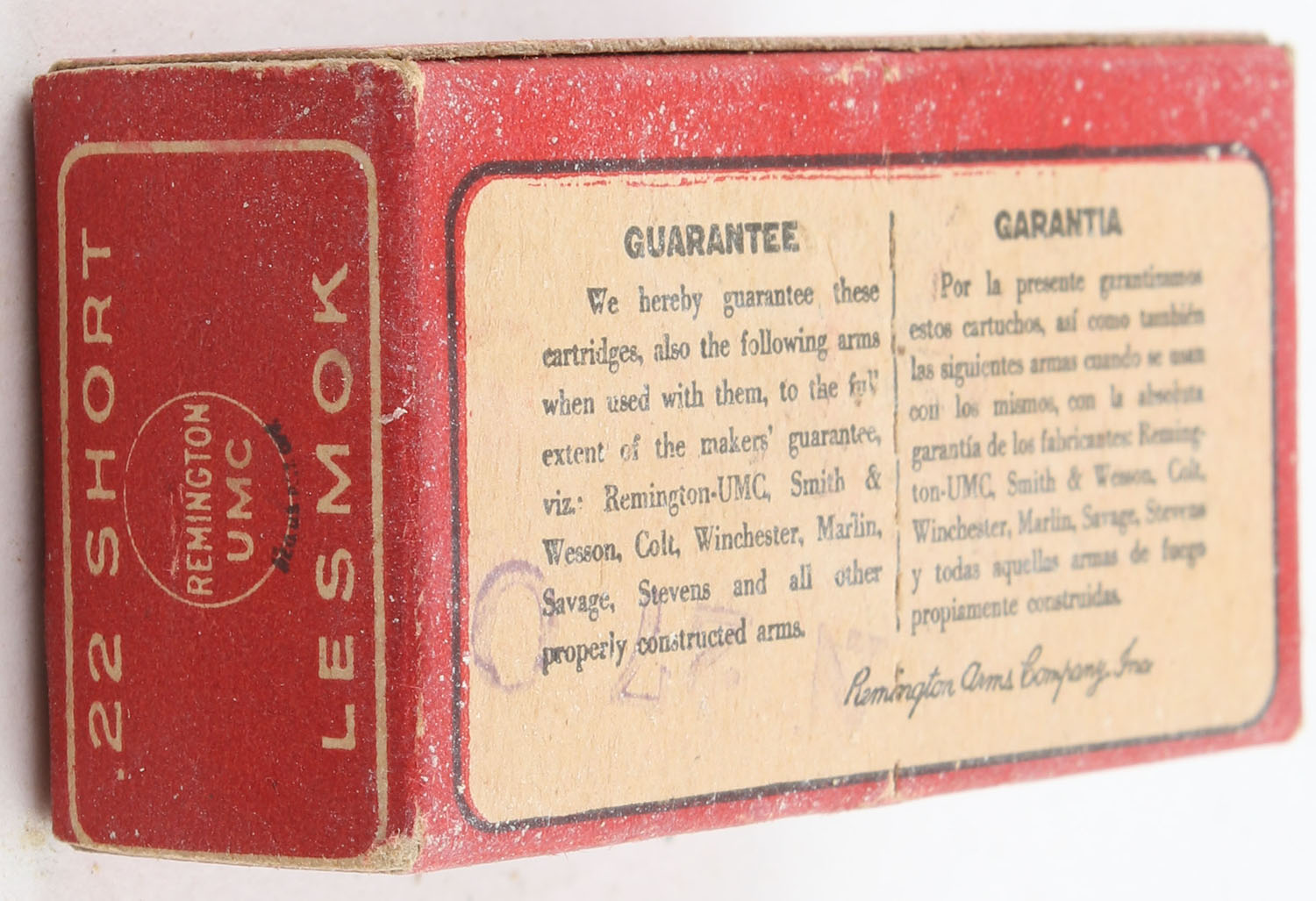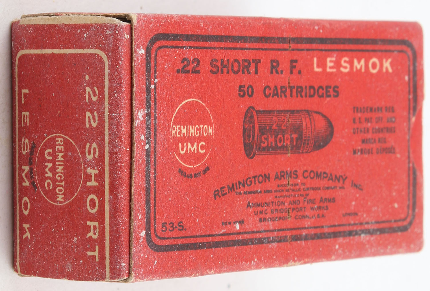 REM-UMC, R.F. Lesmok Cartridges, .22 Short, RHWeb: REM-5 S-2, Full, 1pc. Red black & white box, box is solid with very good color, some shelf wear, minor edge & corner wear, end flaps are solid, ammo is fair to good. Grade: Very Good ++ - Value: 10 to 15