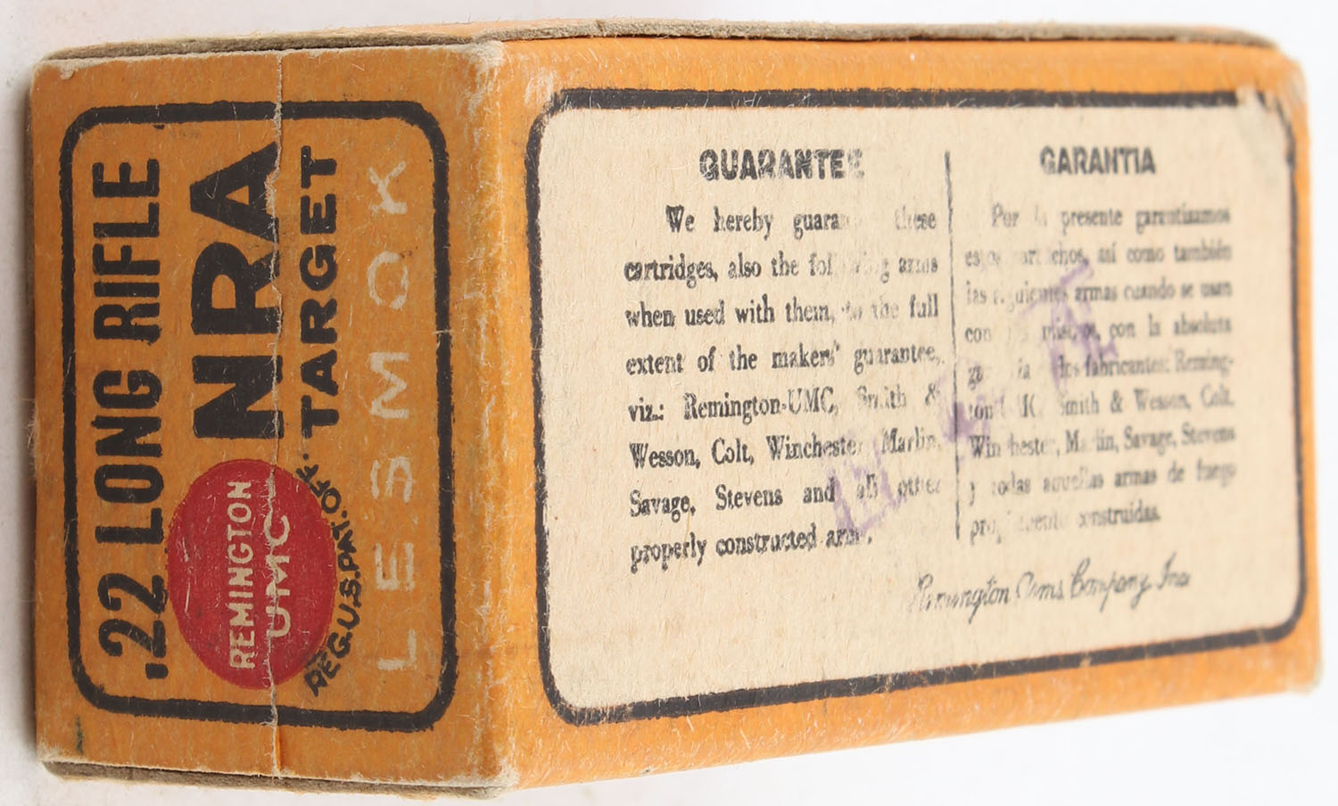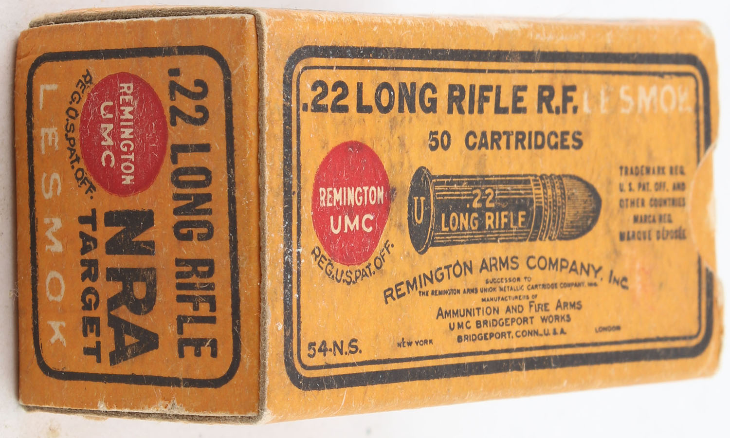 REM-UMC, NRA Target, .22 Long Rifle, Lesmok, RHWeb: REM-51 LR-1, Full, 1pc. Orange black & red box, box is solid with very good color, minor age soiling, very minor corner wear, edges are crisp, end flaps are solid, ammo is good. Grade: Very Good ++ - Value: 60 to 90