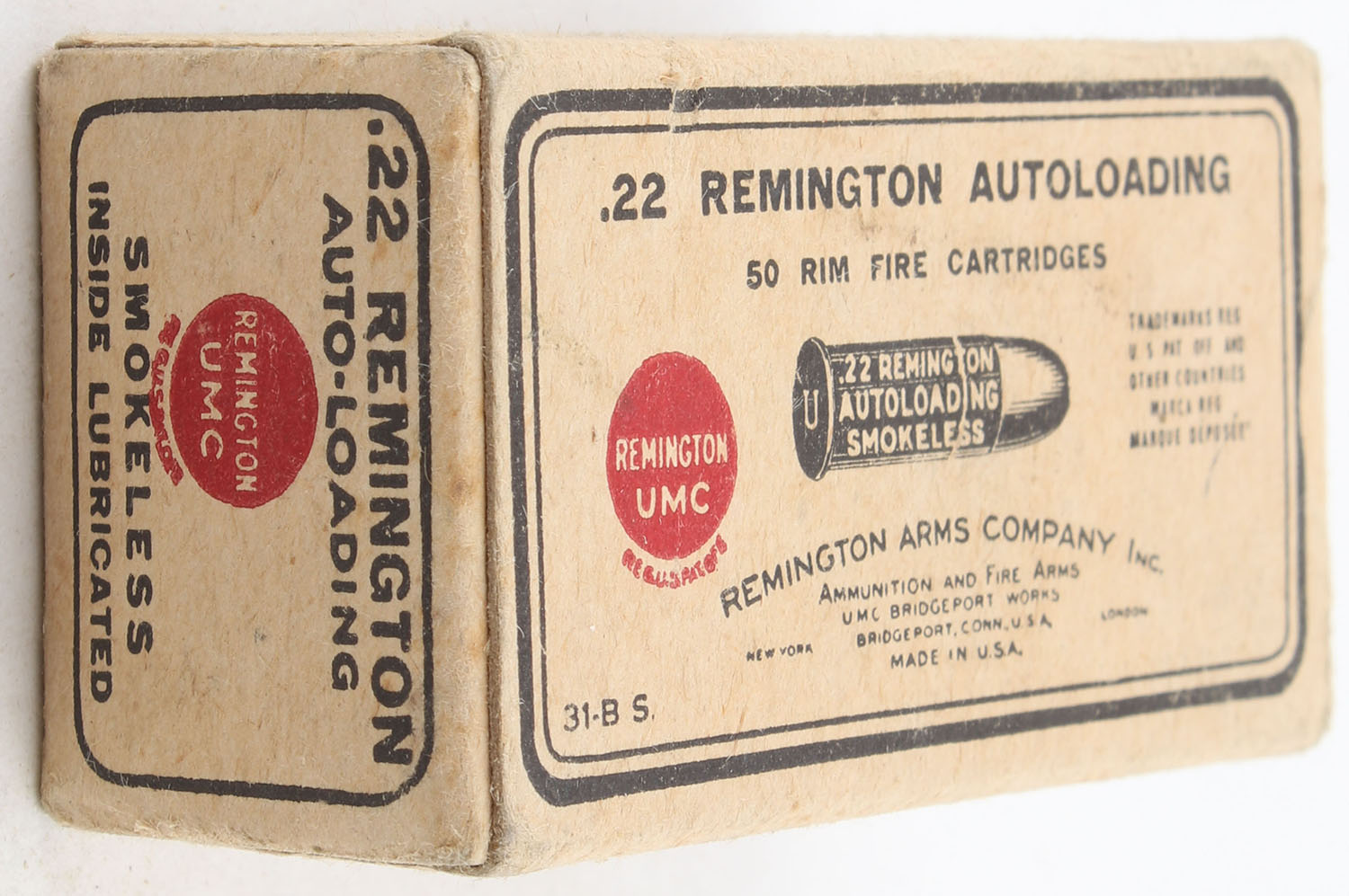 REM-UMC, Rim Fire Cartridges, .22 Remington Autoloading, RHWeb: REM-6 RA-1A, Full, 1pc. Buff black & red box, box is solid with excellent color, minor staining, very minor corner wear, edges are crisp, end flaps are solid, ammo is very good. Grade: Excellent - Value: 80 to 120