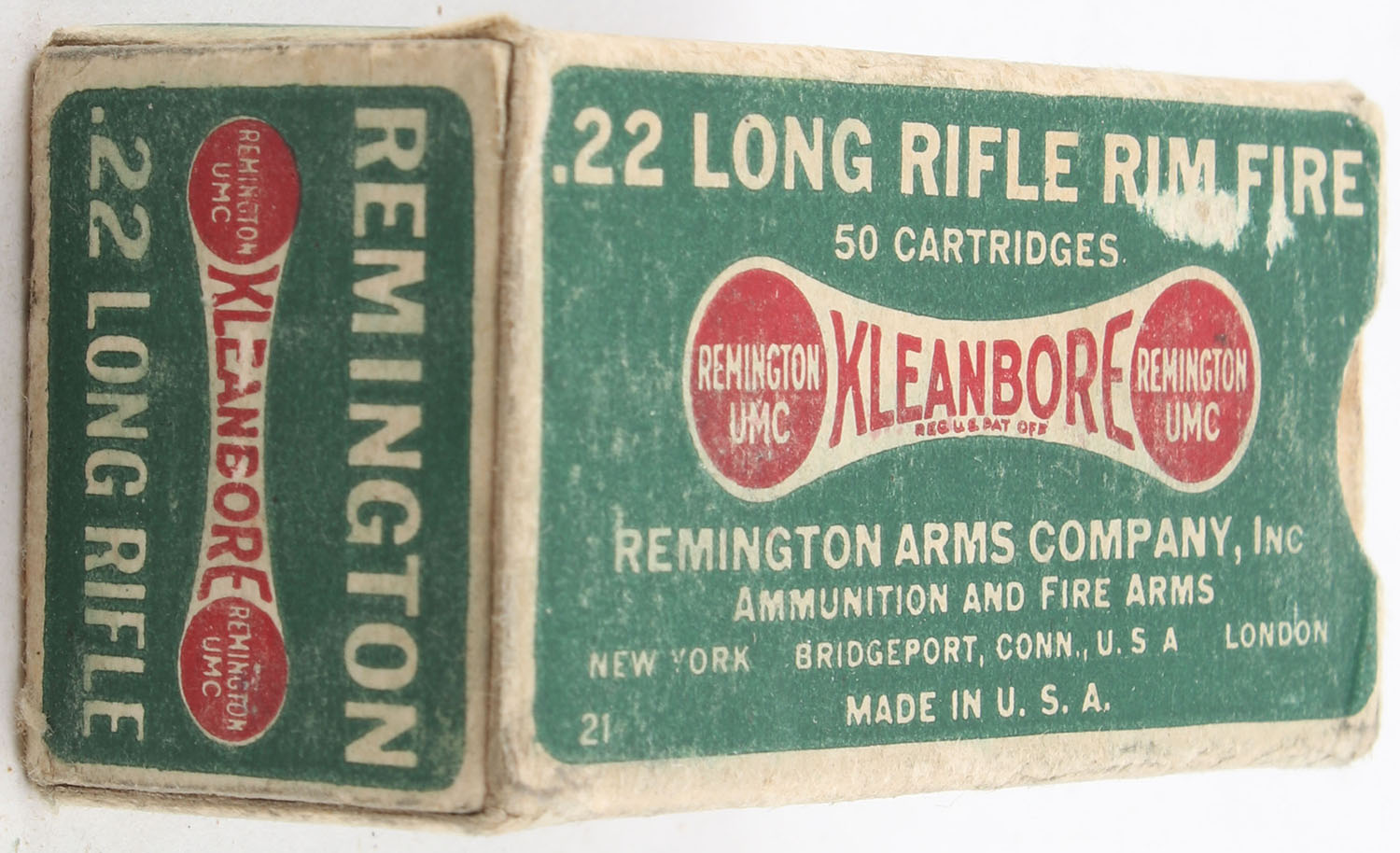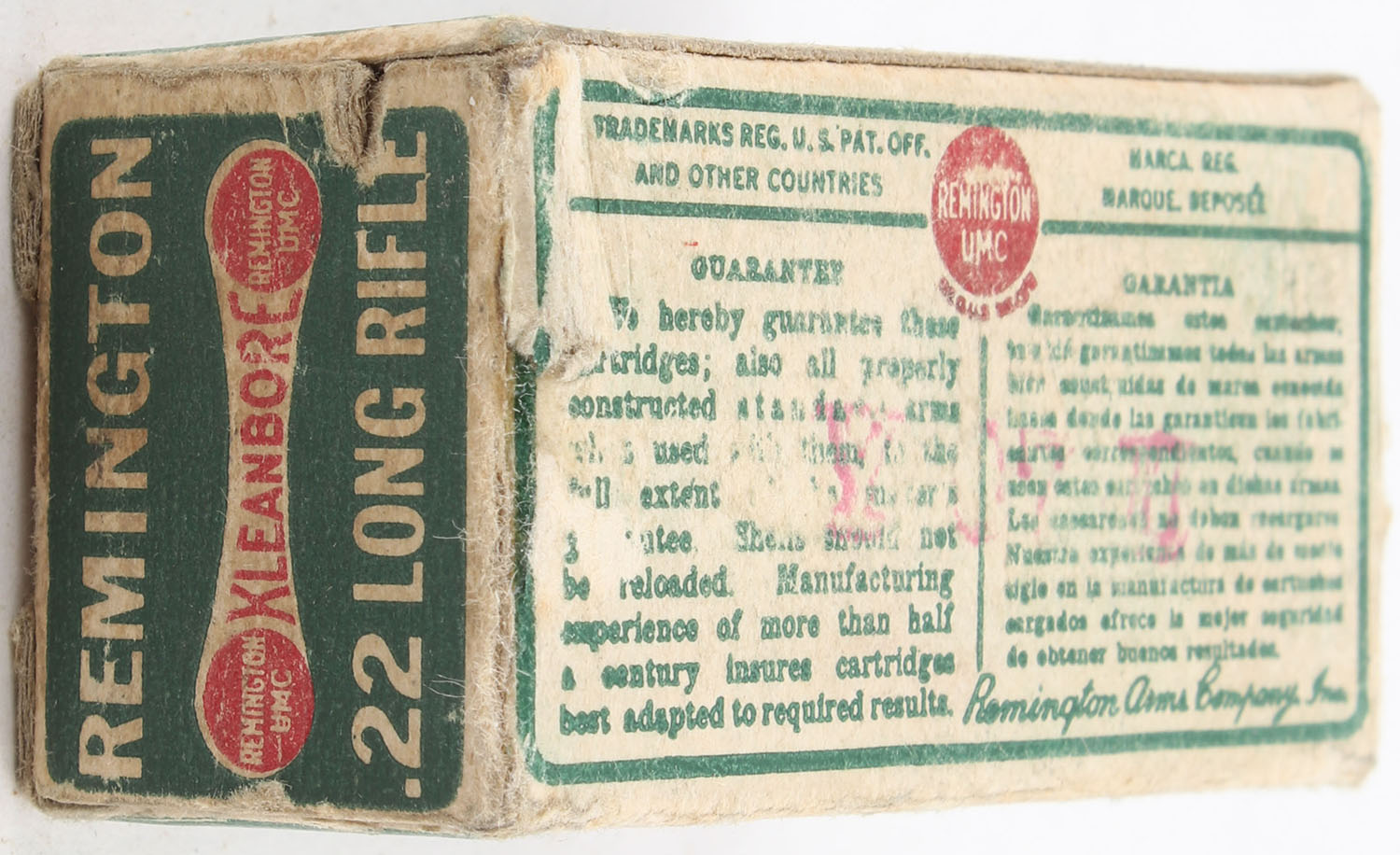 Remington, Kleanbore, .22 Long Rifle, RHWeb: REM-7.1A LR-1b, Full, 1pc. Green buff & red dog bone box, right end flap is torn & has been repaired, very good color, very minor age soiling, minor shelf wear, some corner wear, very minor edge wear, end flaps are solid, ammo is very good to excellent. Grade: Very Good - Value: 12 to 18