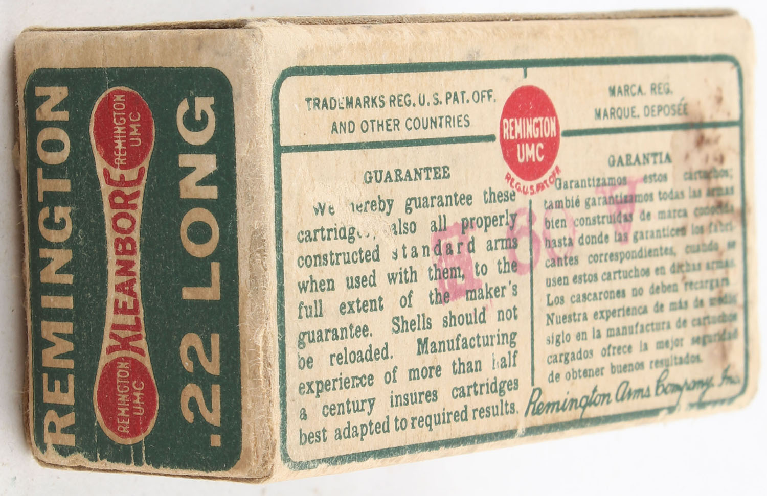 Remington, Kleanbore, .22 Long, RHWeb: REM-7.1B L-1d, Full, 1pc. Green buff & red dog bone box, box is solid with excellent color, very minor age soiling & corner wear, edges are crisp, end flaps are solid, ammo is excellent. Grade: Excellent - Value: 16 to 24
