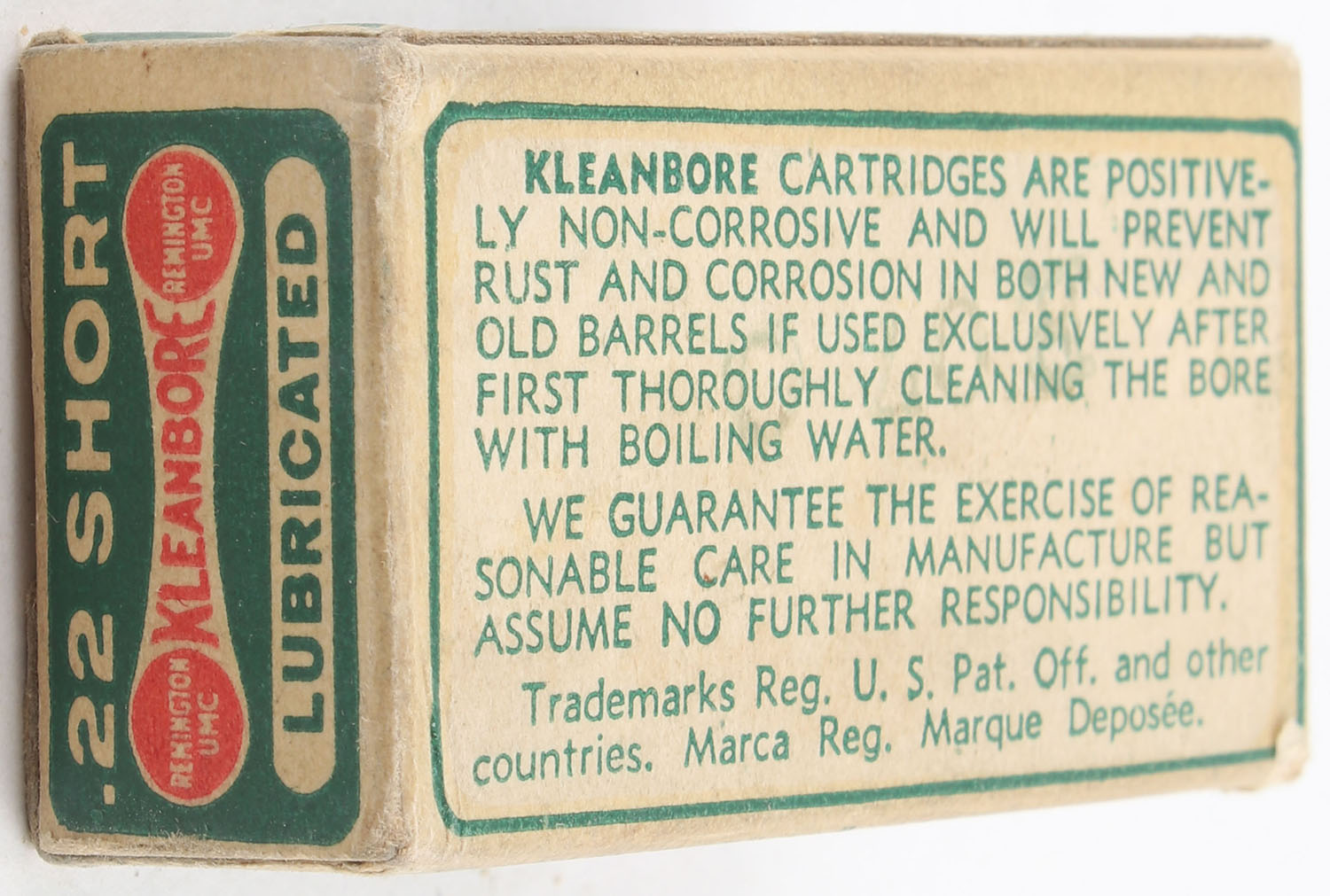 Remington, Kleanbore, .22 Short, RHWeb: REM-7.2 S-1ff, Full, 1pc. Green buff & red dog bone box, box is solid with excellent color, very minor age soiling, minor corner wear, edges are mostly crisp, end flaps are solid, ammo is good to very good. Grade: Excellent - Value: 20 to 30