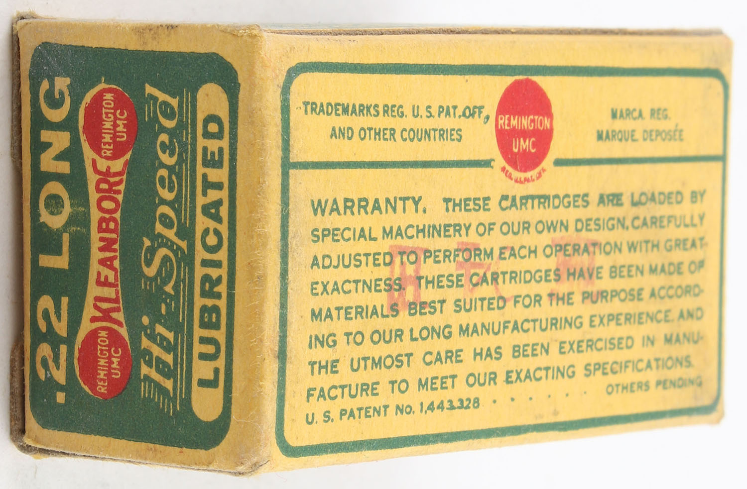 Remington, Kleanbore Hi-Speed, .22 Long, RHWeb: REM-7.4 L-1b, Full, 1pc. Green buff & red dog bone box, box is solid with excellent color, very minor corner wear, edges are crisp, end flaps are solid, ammo is good. Grade: Excellent - Value: 20 to 30