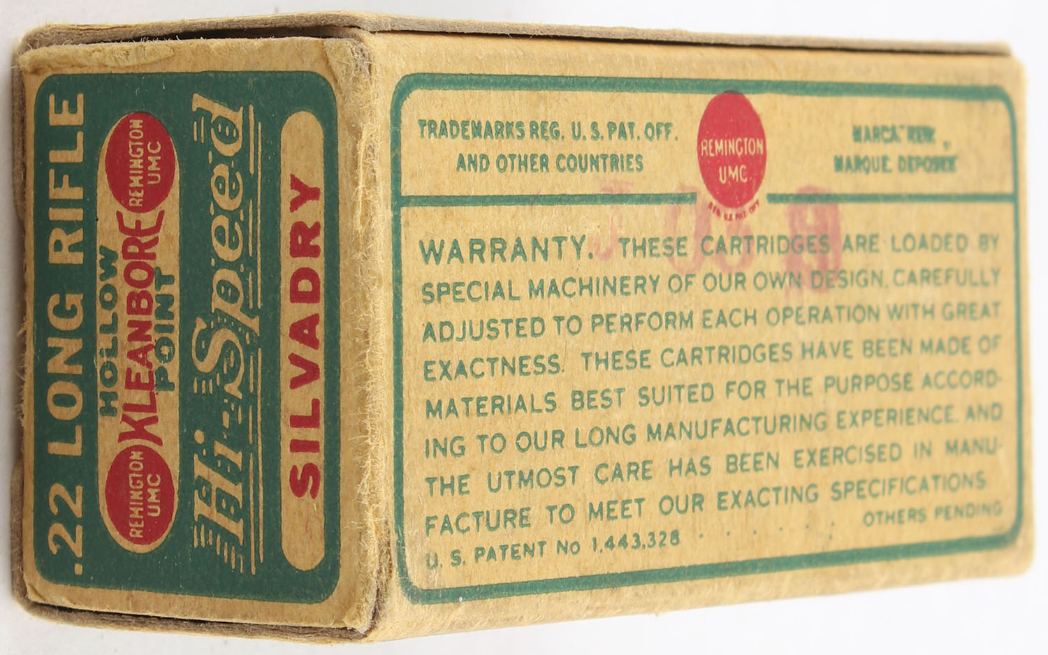 Remington, Kleanbore, Silvadry Hi-Speed, .22 Long Rifle, RHWeb: REM-7.5 LR-3a, Partial 35rds. 1pc. Green buff & red dog bone box, box is solid with very good to excellent color, very minor age soiling, minor edge & corner wear, end flaps are solid, ammo is excellent. Grade: Very Good ++ - Value: 16 to 24