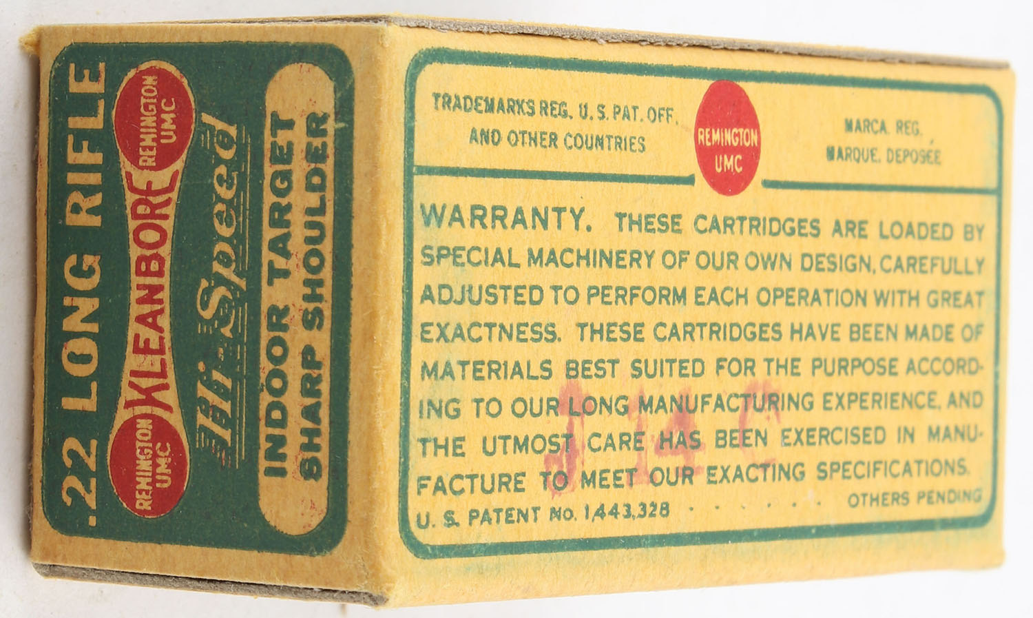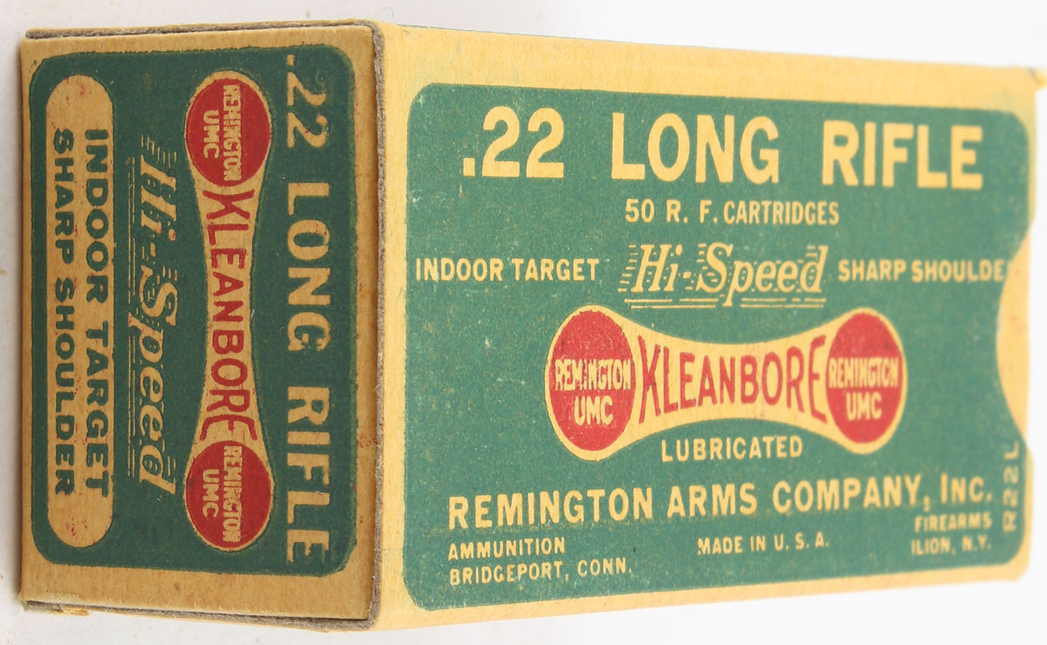 Remington, Kleanbore Hi-Speed, .22 Long Rifle, Indoor Target, Sharp Shoulder, RHWeb: REM-69 LR-1a, Full, 1pc. Green buff & red dog bone box, box is solid with excellent color, very minor corner wear, edges are crisp, end flaps are solid, ammo is very good to excellent. Grade: Excellent - Value: 60 to 90