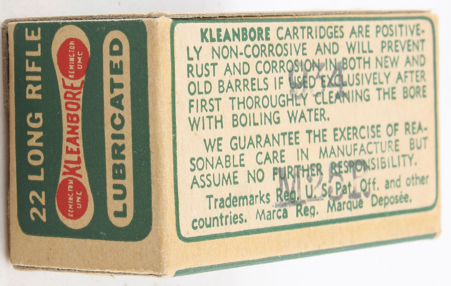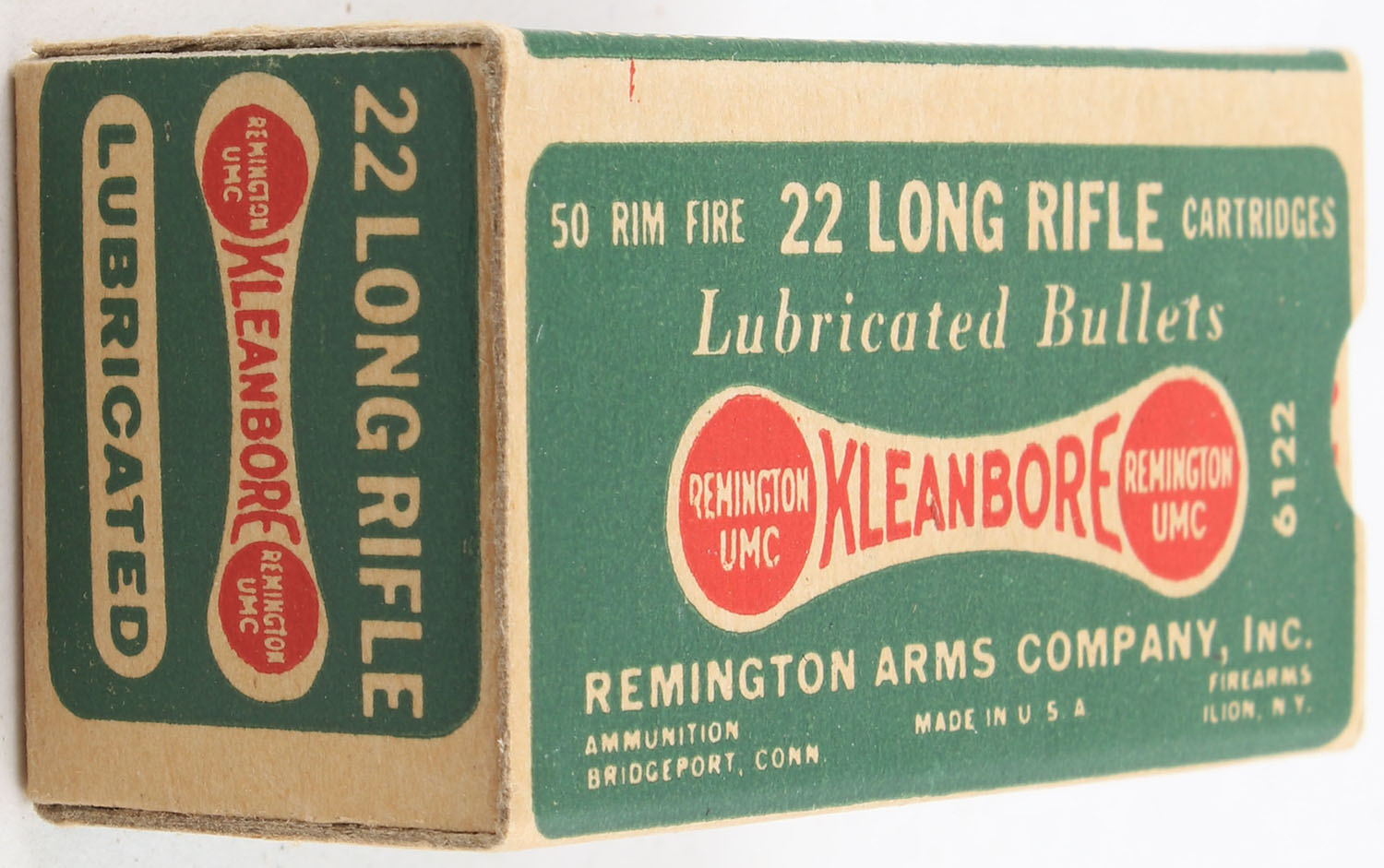 Remington, Kleanbore, .22 Long Rifle, Lubricated Bullets, RHWeb: REM-7.2 LR-5, Full, 1pc. Green buff & red dog bone box, box is MINT with minty color, corners are sharp, edges are crisp, end flaps are solid, ammo is excellent. Grade: MINT - Value: 20 to 30