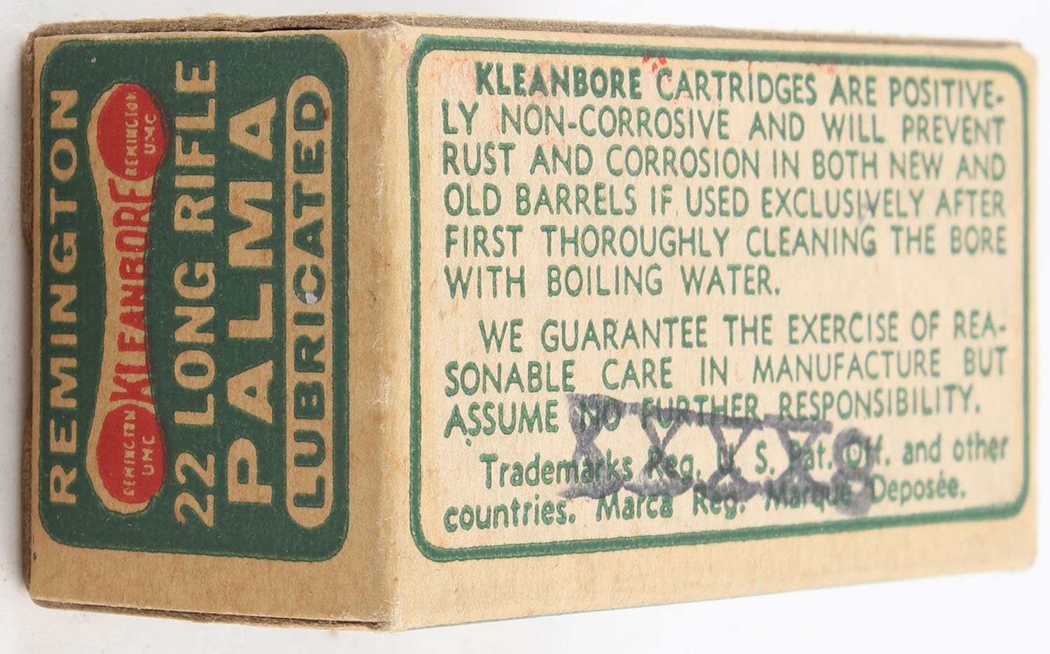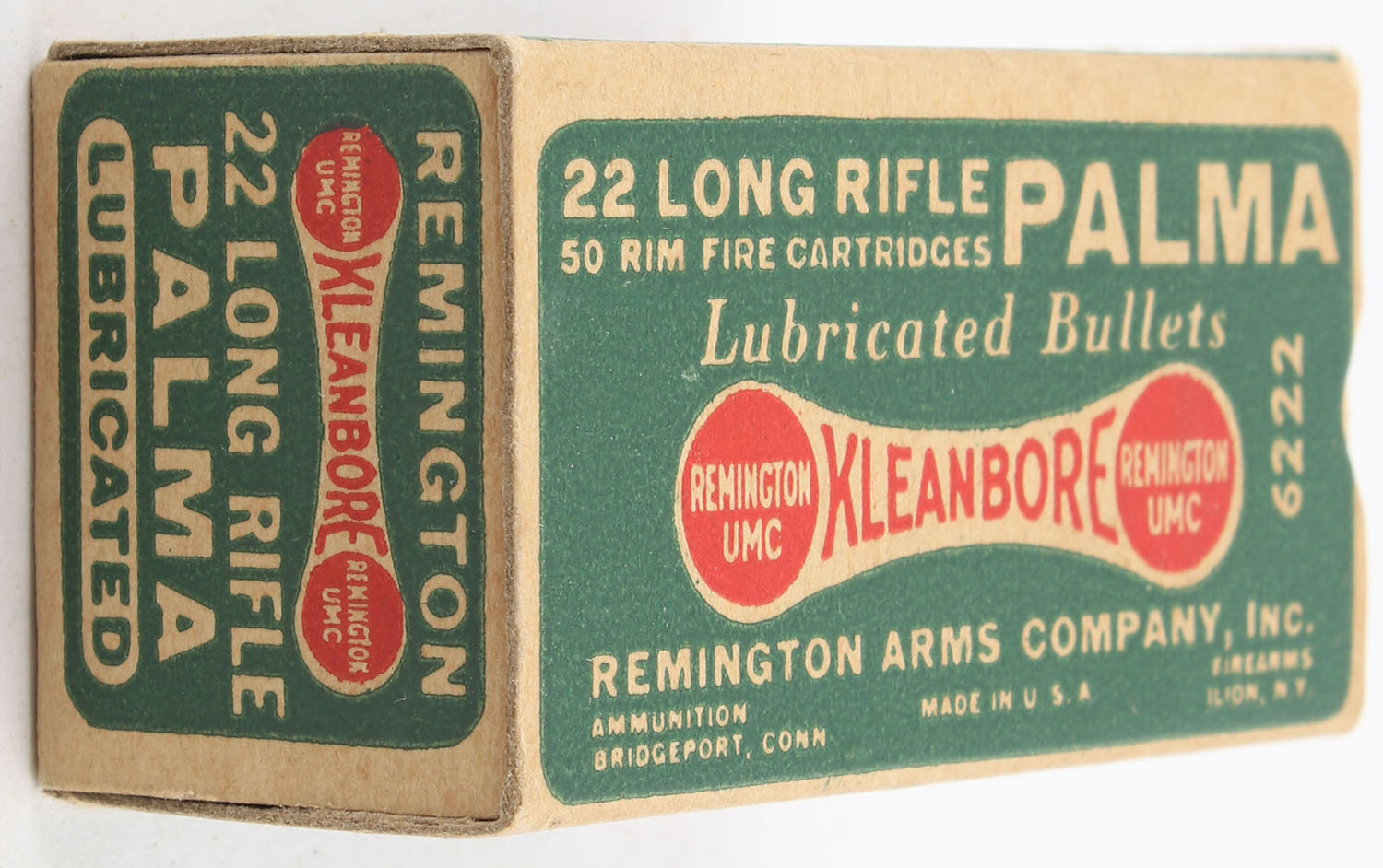 Remington, Kleanbore Palma, .22 Long Rifle, Lubricated Bullets, RHWeb: REM-52 LR-13, Full, 1pc. Green buff & red dog bone box, box is near mint with minty color, only very minor corner wear, edges are crisp, end flaps are solid, ammo is excellent. Grade: Excellent ++ - Value: 12 to 18