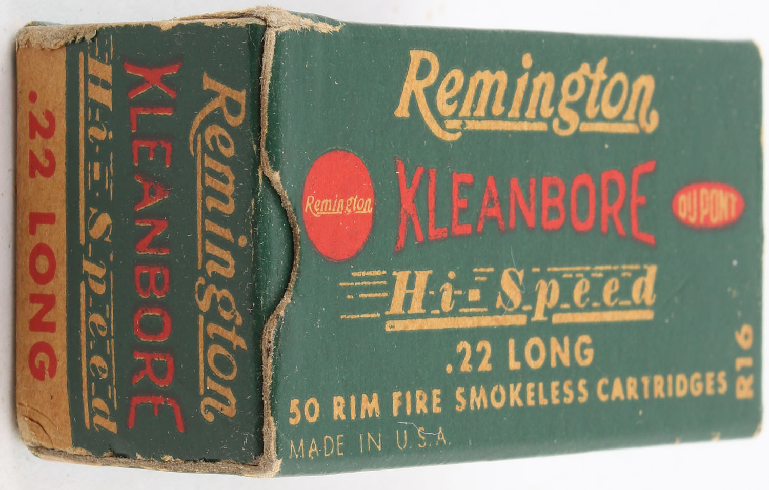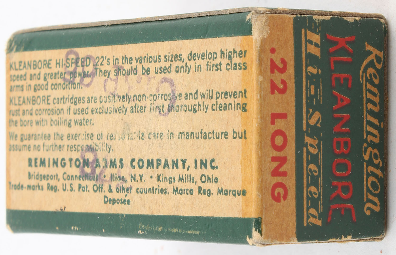 Remington, Kleanbore Hi-Speed, .22 Long, RHWeb: REM-10 L-1a, Full, 1pc. Green buff & red box, box is solid with excellent color, very minor corner wear, edges are mostly crisp, end flaps are solid, ammo is excellent. Grade: Excellent + - Value: 10 to 15