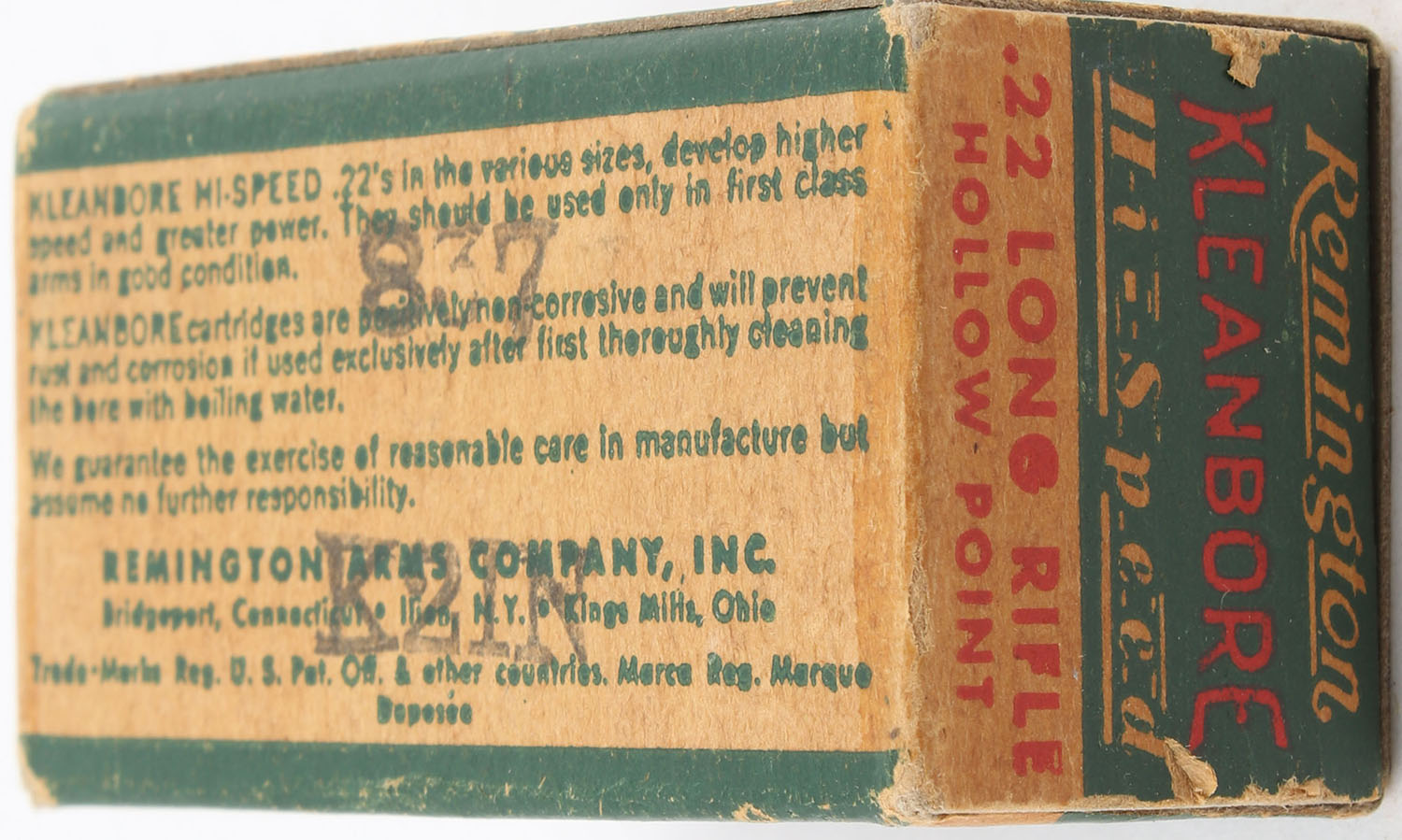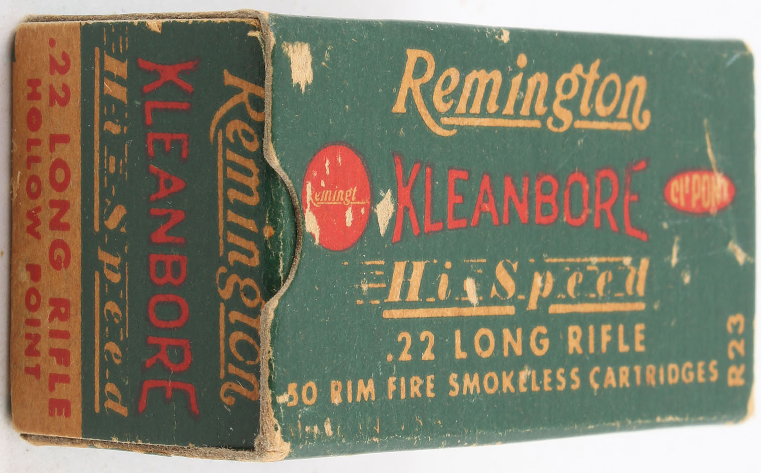 Remington, Kleanbore Hi-Speed, .22 Long Rifle Hollow Point, RHWeb: REM-10 LR-1a, Full, 1pc. Green buff & red box, box is solid with very good color, some age soiling, minor shelf & edge wear, some corner wear, end flaps are solid, ammo is excellent. Grade: Very Good ++ - Value: 4 to 10