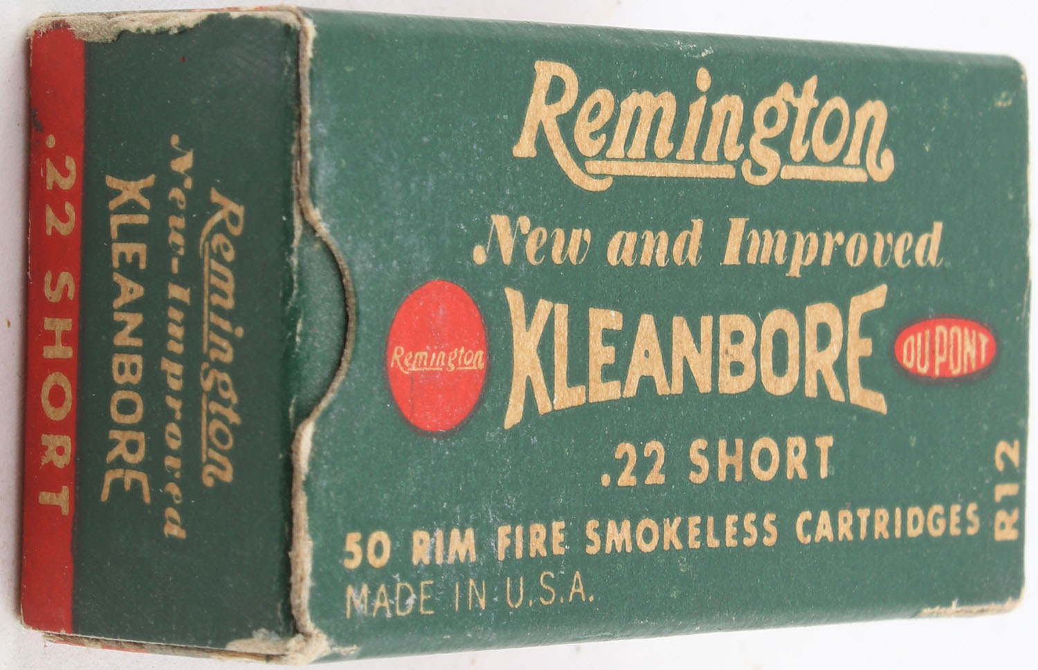 Remington, New and Improved Kleanbore, .22 Short, RHWeb: REM-11 S-1, Partial 38rds., 1pc. Green buff & red box, box is solid with excellent color, minor corner wear, edges are crisp, end flaps are solid, ammo is very good. Grade: Excellent - Value: 6 to 10